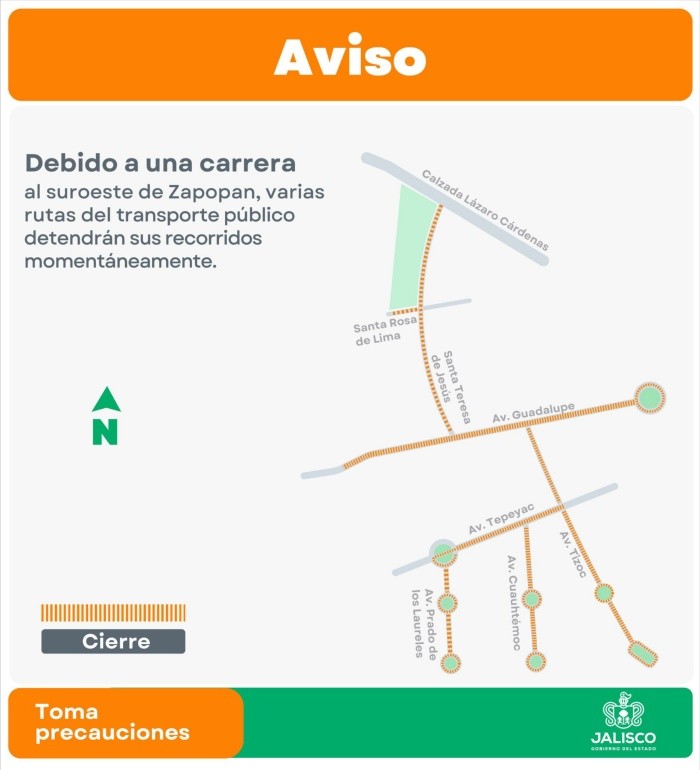 La Secretaría de Transporte Jalisco informó que el próximo domingo 1 de junio algunas rutas de camiones detendrán sus recorridos en la Zona Metropolitana de Guadalajara (ZMG) con motivo de dos carreras deportivas.El primer evento deportivo se realizará en el municipio de Zapopan sobre las avenidas: Prado de los Laureles, Cuauhtémoc, Tizoc, Tepeyac y Guadalupe, y las calles Santa Rosa de Lima y Santa Teresa de Jesús.Las rutas que se detendrán momentáneamente a partir de las 6:30 horas serán: C70,T11A, T11A-C01, T11A-C02 y T11A-C03.La segunda carrera se realizará en la colonia Providencia en Guadalajara, por lo que se cerrará la avenida Montevideo, de igual forma las rutas de camiones que se verán afectadas serán apartir de las 6:30 de la mañana: C54, C64 y C65.NA