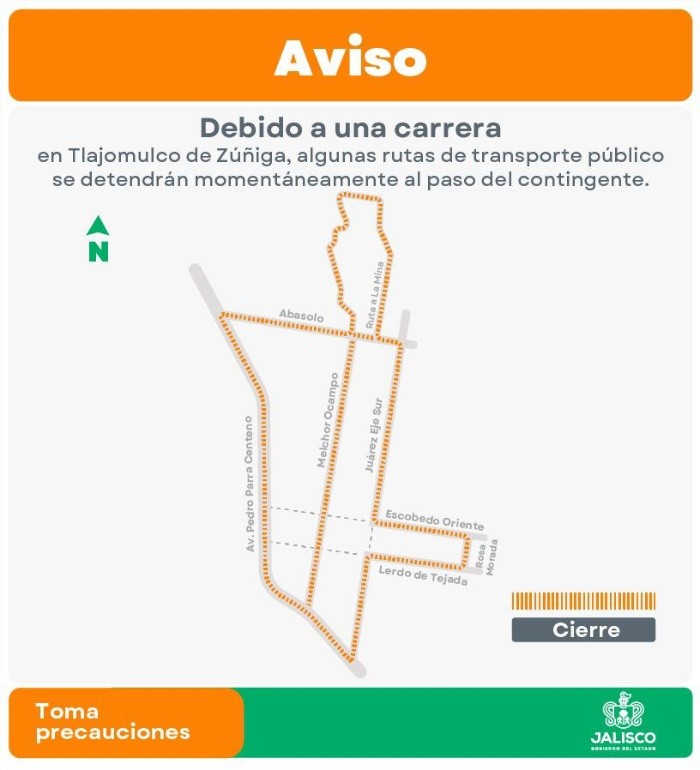 La Secretaría de Transporte Jalisco informó que el próximo domingo 22 de junio varias rutas de camiones detendrán sus recorridos en el municipio de Tlajomulco de Zúñiga, con motivo de la carrera Serial de Atletismo 5K y 10K.Por dicho evento se cerrarán las calles: Lerdo de Tejada, Escobedo Oriente, Abasolo, Ruta a la Mina, Melchor Ocampo, y la avenida Pedro Parra Centeno.Será a partir de las 6:30 de la mañana cuando las siguientes rutas de camiones se detendrán al paso de las y los corredores:Te recomendamos anticipar tus trayectos y tomar las precauciones necesarias.NA