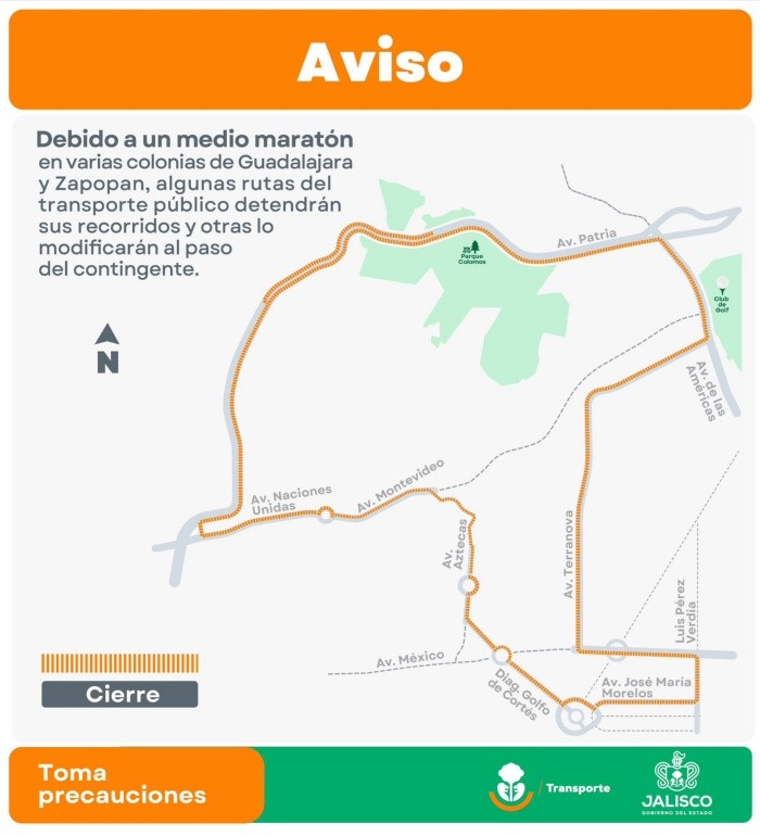 La Secretaría de Transporte Jalisco informó que el próximo domingo 7 de septiembre algunas rutas de camiones detendrán sus recorridos en la Zona Metropolitana de Guadalajara (ZMG) con motivo del 36º Medio Maratón Atlas.Por dicho evento, las siguientes avenidas de los municipios de Guadalajara y Zapopan serán cerradas: Patria, Providencia, México, José María Morelos, Aztecas y Naciones Unidas, también se cerrará Prolongación de las Américas y Diag Golfo de Cortés. Será a partir de las 6:30 de la mañana que las siguientes rutas de camiones se detendrán al paso del contingente: C120, C121A, C121B, C136, C54, C64, C65, C71, C140, T15-C06 Andares, T17, T17-1, T17-C01, T08, T08-C01, T18 López Mateos, T18 Terranova, C01, C104, C107, C119 Circuito, C123-V1, C123-V2, T06-2, C109, C110 dos vías, C74, C79, C108, C124, C140.SITREN L1, C18-V1, C18-V2 y V02 y V03 de la Ruta López Mateos.NA