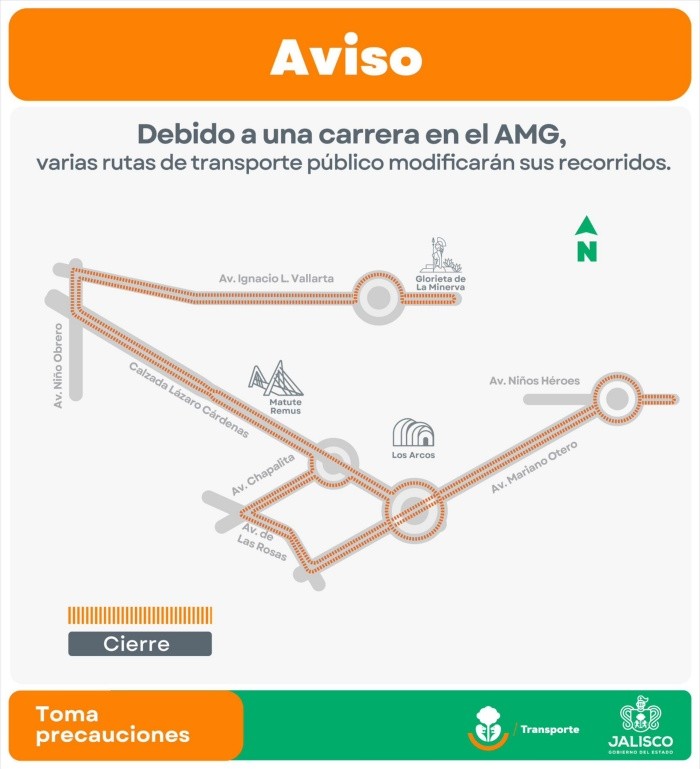 La Secretaría de Transporte Jalisco informó que el próximo domingo 23 de febrero algunas rutas de camiones modificarán sus derroteros y otras pararán en la Zona Metropolitana de Guadalajara (ZMG) a partir de las 6:30 de la mañana.Lo anterior debido al Medio Maratón Guadalajara Electrolit 2025, el cual iniciará en los Arcos Vallarta y recorrerá importantes avenidas como: Vallarta, Niño Obrero, Lázaro Cárdenas, entre otras.La meta del maratón será también en los Arcos Vallarta, siendo el tiempo máximo oficial para finalizar la carrera a las 10:30 horas.NA