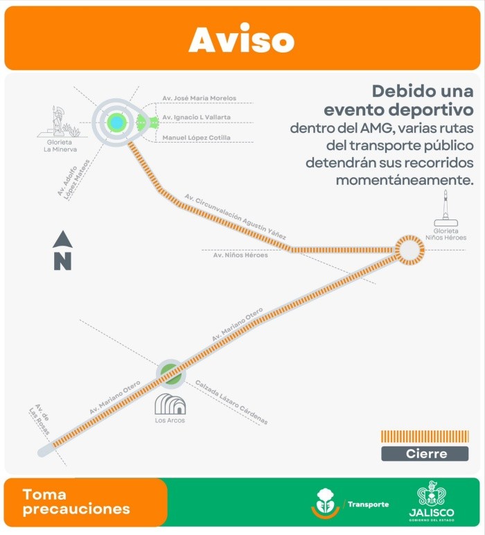 La Secretaría de Transporte Jalisco informó que el próximo domingo 24 de agosto varias rutas de camiones pararán sus recorridos en la Zona Metropolitana de Guadalajara con motivo de dos carreras deportivas. Por la Carrera Internacional Comude Guadalajara y Bomberos 10K se cerrarán las avenidas Circunvalación Agustín Yáñez y Mariano Otero.Por este evento deportivo las siguientes rutas se detendrán a partir de las 6:30 de la mañana del 24 de agosto:C104, C108, C109, C110 dos vías, C121A, C121B, C123-V1, C123-V2, C124, C74, C79, SITREN L1, T18, T18 Terranova, V02 y V03 de la Ruta López Mateos, T18, T18 Terranova, C127, T09-C1 y T09-C2.Por la Carrera Córrele al Mercado Zapopan se cerrarán las siguientes vialidades:De igual forma las rutas que se detendrán al paso del contingente serán a partir de las 6:30 am:C33 Auditorio, C33 Agua Fría, C43 Haciendas del Valle, C43 Valdepeñas, C44, C79, C121-A y T16B-C02.Las rutas que modificarán sus recorridos por la misma carrera serán:C135, T08 Américas, V04 de la #RutaLópezMateos, C72, C73, C84, C85 dos vías, T16B-C06, T16B-C07, T16B-C08, C81, C82, C136, T08-C01, T16A-C01, T16B, T16B-1, T16B-C01, T16B-C03, T16B-C04 y T16B-C05.NA