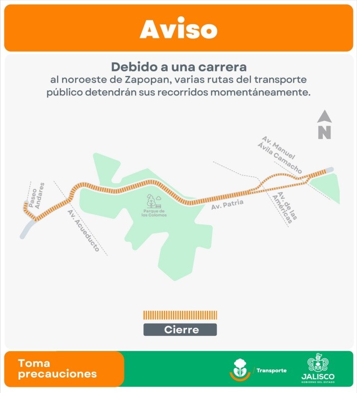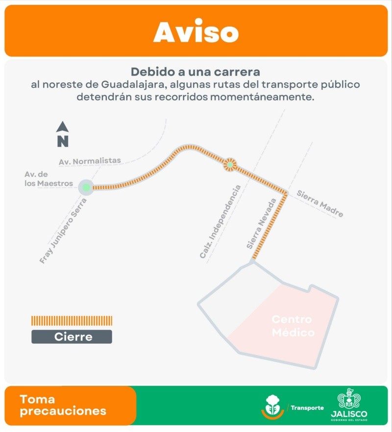 La Secretaría de Transporte Jalisco informó que el próximo domingo 28 de septiembre varias rutas de camiones detendrán y otras modificarán sus recorridos a partir de las 6:30 de la mañana en la Zona Metropolitana de Guadalajara (ZMG) debido a dos carreras deportivas.La primera carrera se realizará en el municipio de Guadalajara por lo que se cerrará la Avenida de los Maestros y la calle Sierra Nevada. Mientras que el segundo evento deportivo será en Zapopan, se cerrará Avenida Patria y Paseo Andares. Por su parte, la última carrera será en Guadalajara, donde se cerrará la Avenida Adolfo López Mateos, General Eulogio Parra, José María Vigil, Montreal, Colomos y la Avenida Pablo Casals. C54, C119 Circuito, C108, T18 López Mateos /Minerva y V03 de la Ruta López Mateos, C120, C121A, C121B, C136, C54, C71, T15-C06 Andares, T17, T17-1 y T17-C01, C64, C65, C69, C16, C21 y A07 de Mi Macro Periférico, C11, C107 y123-V2.C23, C39-V2 La Punta – Hospital Civil, C124 y T13C Centro Médico.NA