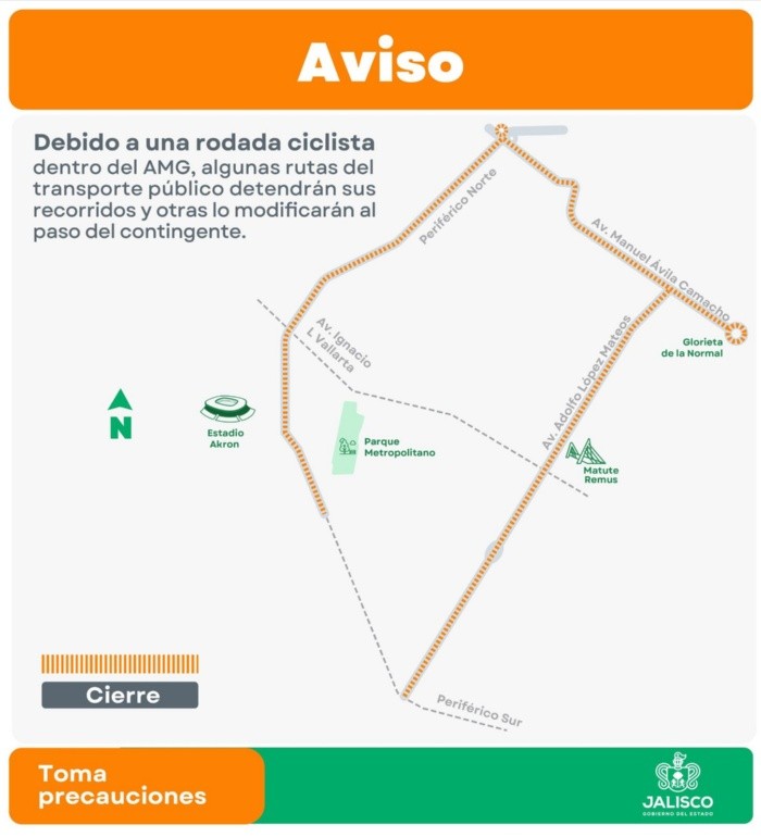 La Secretaría de Transporte Jalisco informó que el próximo domingo 4 de mayo, varias rutas de camiones pararán y otras modificarán sus recorridos en la Zona Metropolitana de Guadalajara (ZMG) con motivo de una carrera ciclista.El recorrido de la carrera se realizará en los municipios de Zapopan, Guadalajara y Tlaquepaque por lo que se cerrarán las avenidas Ávila Camacho, Adolfo López Mateos, Ignacio L. Vallarta y Periferico Norte.Por lo anterior las siguientes rutas pararán momenteneamoe sus recorridos, mientras otras los modificarán a partir de las 6:30 de la mañana:A06 de Mi Macro Periférico, C43 Haciendas del Valle, C43 Valdepeñas, T14A-C02, T14A-C03, T14A-C04 dos vías, T14A-C05, T14B-C02, T15, T15 Dos Templos, T15-C01, T15-C02, T15-C04, T15-C06 Dos Templos, T15-C06 Hospital Civil, T15-C06 Mesa Colorada, C121A dos vías.C136, C73, C88 Milpillas, C89, A- 10 y A-11 de #MiMacroPeriférico, T16A-C01, T16A-C01 Tréboles, T16B, T16B-1, T16B-C01, T16B-C02, T16B-C03, T16B-C04, T16B-C05, C73, T16B-C02, V04 de la Ruta López Mateos, C81, C82, T08-C01, C44, C64, C65, C108, T09-C1, T09-C2, T07, T07-C01.T09-C, T09-C2, C120, C33, C71 dos vías, C85 dos vías.NA