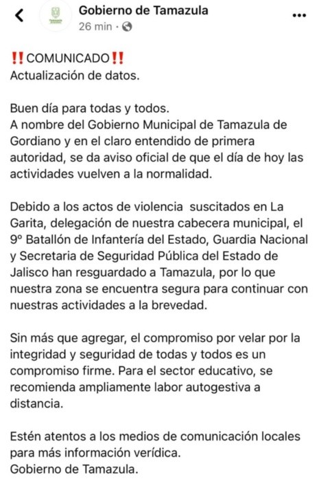 Ante los hechos de inseguridad ocurridos anoche en Jocotepec y Tamazula, el gobernador de Jalisco pidió a la población de estas comunidades, y del Estado en general, que no caigan en pánico, pues ya se ha intervenido para establecer operativos especiales de seguridad.“No hay que caer en el pánico o en el miedo a partir de información que no siempre es precisa, y que en muchos momentos o muchos sentidos pareciera estar difundiéndose para generar miedo en la población. Estamos metidos, estamos atentos”, aseveró el mandatario.Por ello, se reunió esta mañana con autoridades de seguridad del Estado para analizar en conjunto cómo se llevarán a cabo los operativos especiales que se establecerán en los municipios que se vieron afectados anoche por los hechos de inseguridad.También recordó que en aquellos municipios que colindan con “lugares donde hay problemas delicados en materia de violencia”, como Michoacán, Zacatecas y Colima, se han establecido operativos “que han funcionado bien”, por lo que no pueden hacer caer en el miedo a la población.Además, dijo, no se suspenden las clases ni las actividades en general, como lo anunciaron ayer el Gobierno de Tamazula y la Comunidad de La Garita, pues señaló “ninguna autoridad municipal o local tiene la autoridad para suspender actividades”.“No ha habido una afectación directa contra la población civil, no hay un riesgo que implique suspender clases”, añadió el mandatario.Ayer hacia las 20:30 horas dos policías fueron asesinados a balazos por un convoy armado mientras apoyaban en un choque en la carretera Libre a Morelia, en el municipio de Jocotepec. Exactamente dos horas después se dio a conocer que dos camiones de carga habían sido incendiados intencionalmente en la comunidad de La Garita, poblado ubicado dentro del municipio de Tamazula.En el municipio de La Manzanilla de la Paz también se registró otro acto de inseguridad: fue localizado un auto con armas en su interior, incendiándose.Luego de ello, el Ayuntamiento de Tamazula y la Comunidad de la Garita informaron sobre la suspensión de actividades en el municipio “para salvaguardar la integridad de sus ciudadanas y ciudadanos” debido a los hechos de seguridad mencionados.Sin embargo, esta mañana la alcaldía informó que luego de los hechos de inseguridad el municipio fue resguardado por el Noveno Batallón de Infantería, la Guardia Nacional y la Secretaría de Seguridad del Estado, por lo que el día de hoy las actividades volvieron a la normalidad. Sin embargo, para el sector educativo se recomendó “labor autogestiva a distancia”.GC