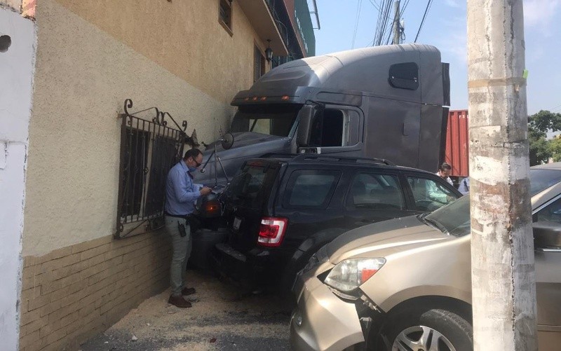 El choque de un tráiler ocurrido esta mañana en la colonia López Portillo en Guadalajara, dejó como saldo una finca y siete vehículos afectados, incluyendo una bicicleta, además de una persona lesionada.Sucedió en el cruce de las avenidas 8 de Julio y Patria, donde el conductor un trailer sin caja, pero con base, perdió el control del vehículo e impactó contra 5 vehículos, para terminar dentro de una finca.“Resulta lesionada una persona que circulaba en una bicicleta y tenemos una casa donde había personas en el interior, las cuales quedaron atrapadas dentro de la casa. Para lograr que salieran se abrió un boquete más grande a un costado de la casa y así sacamos a las personas”, explicó el comandante de la Unidad de Protección Civil y Bomberos Guadalajara, Odin López.El joven, quien circulaba en la bici por el cruce resultó con lesiones leves, según reportó la Unidad, el mismo fue trasladado a un puesto de socorros del municipio para su mejor valoración y posterior atención. Los moradores de la finca resultaron ilesos, añadió la corporación.Entre los vehículos afectados, además de la bicicleta, se encontraban varias camionetas y una motocicleta.Personal de Obras Públicas del municipio se encargó de los peritajes correspondientes para determinar si la finca podrá continuar siendo habitada, por su parte, será la empresa aseguradora del tráiler la que se encargue de lo pagos necesarios a los afectados. Según refirió el conductor del tractocamión, se quedó sin frenos.NR