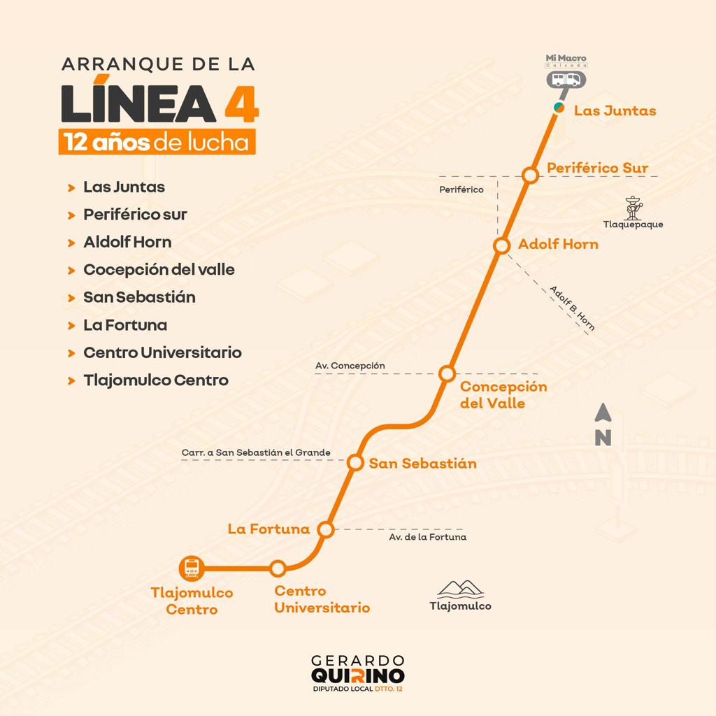 En mayo del año pasado iniciaron las obras de la Línea 4 (L4) del Tren Ligero hacia Tlajomulco y el Gobierno de Jalisco informó este jueves que el avance de los trabajos es de 17% ; prevén que comience operaciones en agosto de 2024.En un recorrido de supervisión a la obra se dio a conocer que se han intervenido 10.5 de los 21 kilómetros que recorrerá la vía que conectará los municipios de Guadalajara con Tlaquepaque y el centro de Tlajomulco de Zúñiga.Serán ocho estaciones que conectarán con centros educativos, de salud y corredores comerciales e industriales y tendrán accesibilidad universal, conectividad a Red Jalisco, información para usuarias y usuarios, cámaras de seguridad y se podrá pagar con la tarjeta Mi Movilidad.La Línea 4 contará con una extensión de 21.1 km. Serán 8 estaciones que podrán recorrerse en 35 minutos:La autoridad estima que el tiempo de recorrido de la Línea 4 , de extremo a extremo, sea de aproximadamente 35 minutos. Según el Gobierno de Jalisco, la Línea 4 del tren ligero a Tlajomulco pasará cerca de comercios y servicios como supermercados; centros universitarios como CUTlajomulco y la Prepa 6, de la UdeG; Centros de Salud del IMSS 180 y 59; Industrias, y colonias principales.