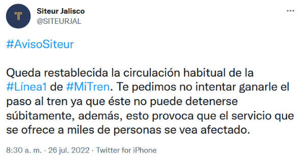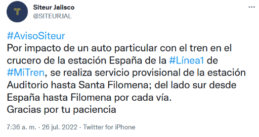 Poco después de las 07:00 horas de hoy, el Sistema de Tren Eléctrico Urbano informó que fue suspendido provisionalmente el servicio en la estación Santa España, de la Línea 1, debido a un accidente automovilístico. Según informaron autoridades, una conductora de un vehículo Toyota Camry, intentó ganarle el paso al Tren Ligero y se impactó en el cruce de Colón y Ahuehuetes. La mujer, de 73 años, se encuentra tuvo lesiones leves y fue atendida por paramédicos de Tlaquepaque.Por su parte, Siteur detalló en su cuenta de Twitter que "debido al impacto de un auto particular con el tren en el crucero de la estación España de la #Línea1 de #MiTren, se establece servicio provisional de la estación Auditorio hasta Santa Filomena".A las 8:30 horas de hoy, Siteur informó que quedó restablecido el servicio, y pidió a la ciudadanía evitar ganarle el paso al tren, ya que miles de personas se ven afectadas por los retrasos en los traslados. GC