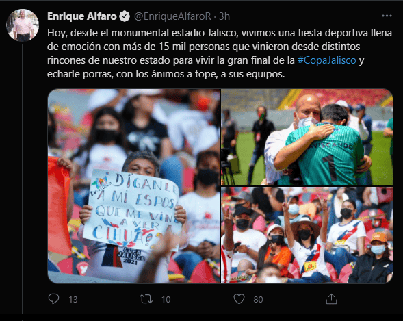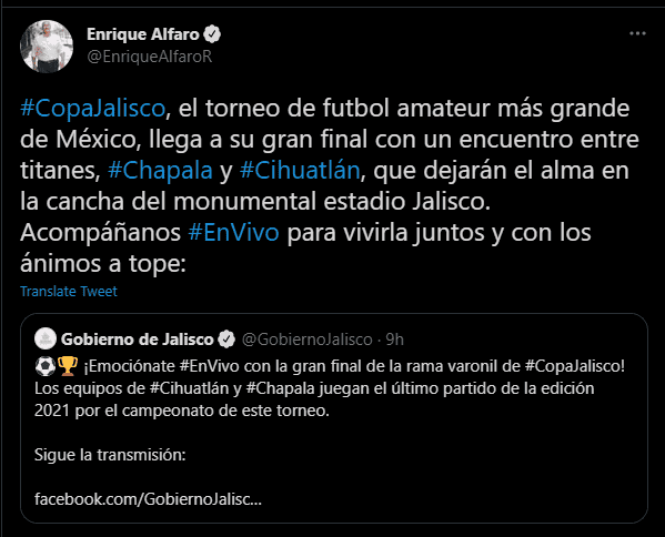 Una vez más, un partido de futbol ha generado que el Gobernador del estado reciba críticas por parte de los ciudadanos a través de sus redes sociales.Este domingo, el mandatario decidió publicar el siguiente mensaje:"#CopaJalisco, el torneo de futbol amateur más grande de México, llega a su gran final con un encuentro entre titanes, #Chapala y #Cihuatlán, que dejarán el alma en la cancha del monumental estadio Jalisco. Acompáñanos #EnVivo para vivirla juntos y con los ánimos a tope".En el texto se incluyó una liga para poder ver la transmisión del encuentro en vivo, sin embargo, los comentarios que recibió, poco tuvieron que ver con el tema deportivo.Algunos usuarios reclamaron que se enfocara a este tema habiendo problemas más graves en el estado:@Freekogdl: "Cuántas familias de Jalisco no podrán asistir a esos eventos porque están buscando a sus seres queridos desaparecidos y todo gracias a qué tú le das más importancia a esto que a la seguridad de todos, cada día me arrepiento de votar por ti, inepto"@OCTAVIOGLEZ: “Su mero mole Góber… pasársela viendo fútbol en lugar de gobernar".@333marylu: “El límite del cinismo! Lo tuyo lo tuyo es el deporte y el protagonismo, gobernar Jalisco te quedó muy pero muy grande!"Al parecer al Gobernador poco le importaron las críticas pues, horas más tarde, compartió un segundo mensaje sobre el evento."Hoy, desde el monumental estadio Jalisco, vivimos una fiesta deportiva llena de emoción con más de 15 mil personas que vinieron desde distintos rincones de nuestro estado para vivir la gran final de la #CopaJalisco y echarle porras, con los ánimos a tope, a sus equipos."Además, aprovechó para enviar sus felicitaciones a los equipos que se coronaron:"Felicidades a #CaboCorrientes de la rama femenil y a #Cihuatlán de la varonil por levantar la copa del torneo de futbol amateur más grande de México. Lo mismo para las jugadoras de #ZapotlánElGrande y los muchachos de #Chapala por llegar a este momento. Se lo ganaron a pulso".Al final, en la rama varonil, el equipo de Cihuatlán logró imponerse a Chapala con marcador de 1-3.En la rama femenil, las integrantes del equipo de Cabo Corrientes se proclamaron campeonas al vencer 1-0 a las de Zapotlán el Grande.Además de promocionar el evento en sus redes sociales, el Gobernador estuvo presente en el Estadio Jalisco en donde se metió hasta los vestidores, según se muestra en un video que ha circulado a través de distintos grupos de Whatsapp, en el que se le ve con el equipo de Chapala antes de que salieran a disputar el encuentro.Esta no es la primera vez que un evento deportivo desata críticas contra el mandatario. El pasado 12 de mayo el Gobernador se presentó en la final de ida de la Liga de Expansión entre el Tepatitlán FC y el Atlético Morelia.