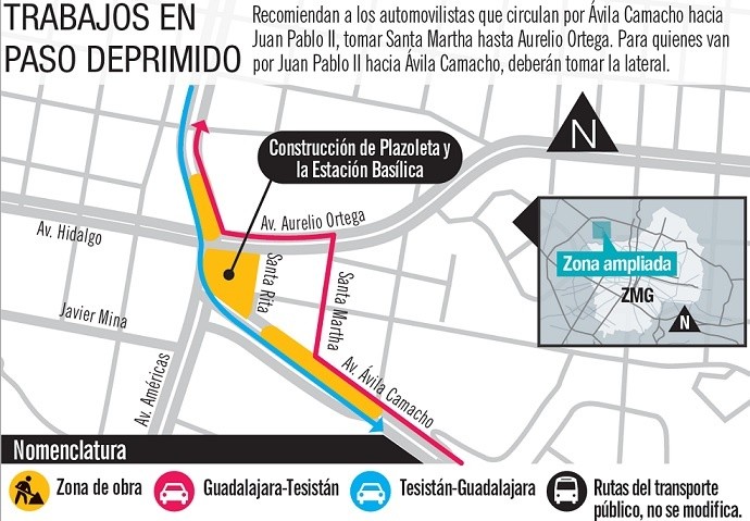 Para los automovilistas que circulan por la Avenida Ávila Camacho hacia la Avenida Juan Pablo II (Laureles), la ruta alterna será por la calle Santa Martha hasta la Avenida Aurelio Ortega para llegar a Juan Pablo II.