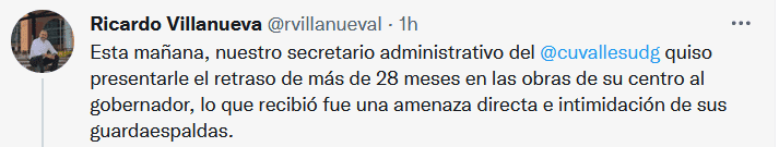Luego de lo que fueron consideradas como amenazas contra el secretario del Centro Universitario de los Valles (CUValles), Luis León, el rector Ricardo Villanueva lamentó el hecho. “Esta mañana, nuestro secretario administrativo del CUValles quiso presentarle el retraso de más de 28 meses en las obras de su centro al gobernador. Lo que recibió fue una amenaza directa e intimidación de sus guardaespaldas”.Luego compartió un par de vídeos donde se aprecia cómo se acerca el funcionario al gobernador y a su comitiva para hacerle llegar la inconformidad ante el retraso de las obras, a lo cual el gobernador le respondió que “midiera sus palabras”: “Estás faltándole al respeto a los diputados, al presidente municipal y al gobernador, nada más mídele bien tus palabras”, dice el mandatario mientras se acerca al secretario. “Esta es mi casa también, yo soy universitario”.El rector de la UdeG reconoció “por su valentía y compostura” a la rectora del Centro, María Luisa García, así como a Luis León. “Ninguna amenaza va a callar la voz universitaria. No estás solo Luis León, cuentas con todo el apoyo y solidaridad de las y los más de 300 mil universitarios de la UdeG”.A traves de un comunicado, la UdeG informó que el gobernador acudió sin previo aviso a las instalaciones de CUValles; sin embargo, la comunidad de este centro, encabezada por María Luisa García, intentó dialogar con el gobernador sobre las necesidades, con documentos sobre las obras pendientes. “Sin embargo, el mandatario rechazó e ignoró los argumentos que se le presentaron, sin mostrar interés ni apertura al diálogo. Luego pidió a su equipo grabar un video con el plantel universitario como escenografía”.Luis León le recordó que hay 40 millones de pesos que no se han ejercicio adecuadamente por el Instituto de la Infraestructura Física Educativa del Estado de Jalisco (Infejal), obra contratada por el Gobierno estatal.“Aquí están las carátulas de los contratos. Aquí viene todo, y creo que no es adecuado lo que está pasando. No nos vengan a decir, en nuestra casa, cosas que no son ciertas”.“Hemos estado pidiendo que terminen las obras inconclusas. Esto nos afecta mucho porque no podemos ampliar la matrícula que, para nosotros, es importante, porque retrasan la posibilidad de crecer la matrícula de mil 500 alumnos y que tengan mejores condiciones de trabajo”, subrayó García cuando el mandatario se alejaba.Al respecto, el equipo de comunicación del gobernador señaló que lo expresado por el mandatario no fue ninguna amenaza. Al contrario, “fue el propio grupo de la UdeG el que fue al evento del CUValles a provocar, a amenazar y a reventar el evento”.Añadió que “el Gobierno de Jalisco sigue concentrado en su programa Obras son Amores, que consiste en remodelar y hacer nueva infraestructura para la UdeG con una inversión de 228 millones de pesos. Hoy el programa continúa y arrancó sus obras en el interior de Jalisco, con una inversión de 11 millones de pesos para renovar la infraestructura de del CUValles”.GC