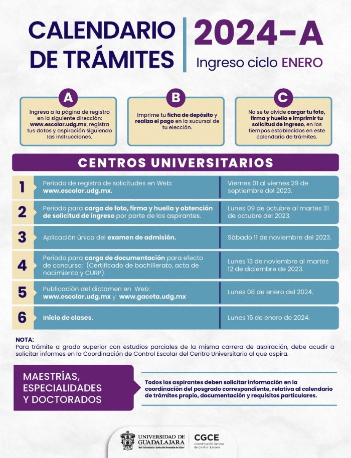 Dos veces al año, miles de jóvenes de Jalisco, del resto de México e incluso del mundo realizan trámites para ingresar a la Universidad de Guadalajara, ya sea para la preparatoria, licenciatura, maestrías y doctorados.El calendario escolar está dividido en dos semestres, o dos ciclos, "A" y "B", que corresponden de enero a julio, y de agosto a diciembre. Este 2024, el calendario que corresponde a los interesados por ingresar a la casa de estudios es el 2024 "A", cuyos trámites dieron inicio el pasado viernes 1 de septiembre de 2023, con la documentación debida y los exámenes de admisión. De acuerdo con el calendario oficial de la Universidad de Guadalajara, los resultados serán compartidos este lunes 8 de enero del 2024, en las páginas oficiales de la institución educativa, así como en su diario La Gaceta. De modo que los estudiantes deben de estar atentos desde las primeras horas del lunes para conocer si fueron admitidos o no a las aulas. Las clases darán inicio el martes 16 de enero del 2024. Mantente al día con las noticias, únete a nuestro canal de WhatsAppFS