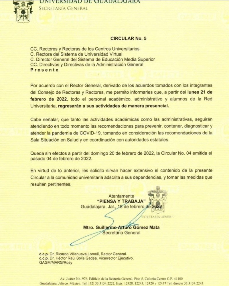 La Universidad de Guadalajara (UdeG) informó, a través de una circular, que por acuerdo con el rector general, y derivado de acuerdos tomados con los integrantes del Consejo de rectoras y rectores, a partir de este lunes 21 de febrero todo el personal académico, administrativo y alumnos de la red universitaria regresarán a sus actividades de manera presencial."Tanto las actividades académicas como las administrativas seguirán atendiendo en todo momento las recomendaciones para prevenir, contener, diagnosticar y atender la pandemia de COVID-19 tomando en cuenta las recomendaciones de la Sala de Situación de Salud y en coordinación con autoridades estatales", añade el documento.Los estudiantes de la UdeG ya habían comenzado con el retorno a las aulas desde el pasado 8 de febrero, pero era de manera preferente.En esa ocasión, cada Centro Universitario y el Sistema de Educación Media Superior determinó el esquema de regreso a clases, dependiendo de sus circunstancias particulares.Sin embargo, ahora el anuncio señala que este modelo ya se aplicará en su totalidad y toda la red universitaria deberá de acudir de manera presencial.