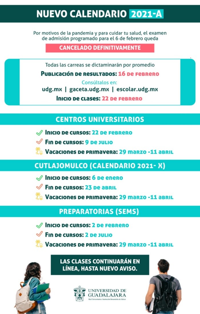 La Universidad de Guadalajara (UdeG) publica vía Internet los resultados del examen de admisión para nuevos estudiantes en carreras de todos sus Centros Universitarios.Desde el primer minuto del martes 16 de febrero de 2021 están disponibles en línea los resultados del dictamen de Admisión Calendario 2021-A de la Universidad de Guadalajara, que inician clases el próximo 22 de febrero.Para facilitar el acceso resultados de admisión de la UdeG y como servicio a la comunidad universitaria, EL INFORMADOR replicará los resultados oficiales de la UdeG en el sitio especial www.informador.mx/listas-udg (a partir de las 00:00 horas del 16 de febrero). Para utilizar el servicio sólo debes conocer el código de registro del aspirante para saber el resultado de admisión.Los sitios oficiales de la Universidad de Guadalajara: escolar.udg.mx, o udg.mx son la primera opción para consultar el dictamen, sin embargo debido a la alta demanda de consultas, estos sitios pueden tener demoras en la respuesta o fallas de disponibilidad.Otras opciones para consultar los resultados oficiales de la UdeG por internet son los sitios del SIIAU (Sistema Integral de Información y Administración Universitaria), y el de La Gaceta de la Universidad de Guadalajara.Quienes fueron aceptados para ingresar a algún plantel de la UdeG deberán consultar los siguientes pasos en el sitio escolar.udg.mx y presentarse en las escuelas en las que fueron admitidos para completar los procedimientos de inscripción.El primer día de clases será el próximo lunes 22 de febrero de 2021 para los estudiantes de primer ingreso en licenciaturas de la Universidad de Guadalajara.Si no fuiste admitido a la carrera que hiciste trámites, debes saber que la UdeG ofrece algunos cupos disponibles para otras carreras que se anunciarán en los sitios oficiales y redes sociales de la Universidad. De otra manera deberás retirar tus documentos para volverlo a intentar próximamente.El calendario de trámites 2021 A de la Universidad de Guadalajara tuvo varios traspiés antes de anunciar a los nuevos admitidos a las carreras.Luego de la cancelación del primer examen de admisión de la UdeG por las denuncias sobre la circulación de una sección de la prueba aplicada el 19, 20 y 21 de noviembre de 2020, una segunda fecha para reponer el examen estaba programada para el pasado 6 de enero.Sin embargo, debido a la emergencia por la pandemia de COVID-19 en Jalisco, la Universidad de Guadalajara decidió cancelar definitivamente el examen y asignar los cupos para nuevo ingreso a partir de la calificación promedio de la preparatoria.Desde julio de 2019, la Universidad de Guadalajara tomó la determinación de que la consulta fuera solamente virtual y con esta decisión generó un ahorro de 700 mil pesos.Ya no imprimir las listas de admitidos en la Universidad de Guadalajara (UdeG) era un paso que se tenía que dar debido a que “en los últimos ciclos vimos que ya no había tanta demanda de La Gaceta. No ha pasado nada, porque las nuevas generaciones viven con la tecnología”, dijo Roberto Rivas Montiel, coordinador general de Control Escolar.SR