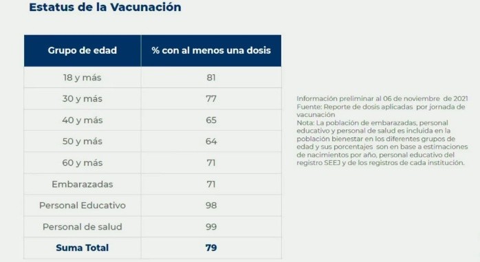 Los jóvenes de 18 a 29 años en Jalisco son los que mejor respuesta han tenido para aplicarse la vacuna y prevenir casos graves de COVID-19. El Gobierno del Estado presumió que el 81% de los jóvenes en este rango de edad ya recibió al menos una dosis del biológico.El gobernador de Jalisco destacó la buena recepción de los jóvenes que, dijo, están en proceso de que les apliquen las segundas dosis."Son los que mejor han respondido, apenas tienen la primera dosis, pero confiamos en que van a hacerlo igual para la segunda dosis, que está en proceso. Es el grupo de edad que mejor respuesta ha tenido", comentó el titular del Poder Ejecutivo estatal.En el grupo poblacional de 30 a 39 años, el 77% ya se aplicaron al menos una dosis; entre las personas de 40 a 49 años, la cobertura llega 65%.La menor respuesta a la vacunación se presenta entre los adultos de 50 a 59 años; sólo 64% se han inmunizado; mientras que 71 de cada 100 adultos de 60 años y más ya acudieron a vacunarse.Destaca que en el caso de las mujeres embarazadas sólo 71% se han inmunizado, mientras que el 98% del personal docente ya lo hizo y en el personal de salud en el Estado el nivel de vacunación llegó al 99% de la plantilla.Aunque las estadísticas estatales refieren 79% de cobertura de la vacuna anti COVID, en la plataforma de la Secretaría de Salud federal, Jalisco aparece con 76% de avance y figura por debajo del promedio nacional que es de 84% de cobertura.IM