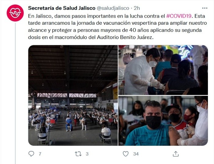 La tarde de este lunes, la Secretaría de Salud Jalisco (SSJ) incorporó la jornada vespertina de vacunación contra COVID-19 en el macromódulo metropolitano habilitado en el Auditorio Benito Juárez, en Zapopan.El secretario de salud, Fernando Petersen supervisó la jornada vespertina bajo el Modelo Jalisco de Vacunación, que incluye el sistema de citas vía web. El titular invitó a la población invito acudir a la hora determinada, sólo con 15 minutos de anticipación.“Estamos vacunando 40 años y más, por lo que te recordamos uno: que no pierdas tu cita, son muy importantes tus citas y no olvides tus papeles”, expresó el servidor público.Las vacunas que se están aplicando durante la tarde corresponden a las jornadas activas según el calendario. En la semana del 20 al 24 de septiembre se estarán aplicando alrededor de 60 mil segundas dosis de la farmacéutica AztraZeneca antes del 16 de julio.Se destinarán entre 12 mil y 14 mil vacunas por día para ser aplicadas en un horario de 15:30 a 19:00 horas.En las próximas semanas en el turno vespertino se aplicarán tanto segundas como primeras dosis, de acuerdo a las convocatorias publicadas en las redes sociales del Gobierno del Estado.Destacaron que por la tarde no se atenderán incidencias, por lo que exigen que solamente vayan personas con la cita emitida en la plataforma https://vacunacion.jalisco.gob.mx en convocatoria abierta.La SSJ emitió las siguientes recomendaciones:Si te interesó esta noticia y quieres saber más, entonces descarga y descubre INFORMAPlus, la aplicación digital de EL INFORMADOR, en donde tenemos contenidos exclusivos, seleccionados por nuestros editores, para darles una experiencia más completa a los lectores. Si eres suscriptor de EL INFORMADOR tu acceso está incluido, solicítalo al 33 3678-7777.Descarga la aplicación y pruébala GRATIS por treinta días.Para iOS: https://apple.co/35jaVgbPara Android: https://bit.ly/3gwVSEVJM