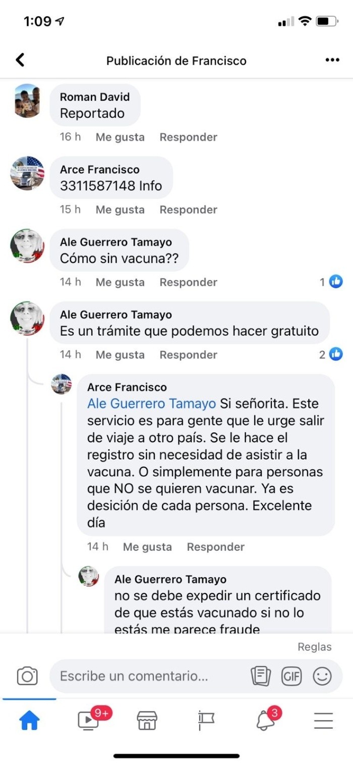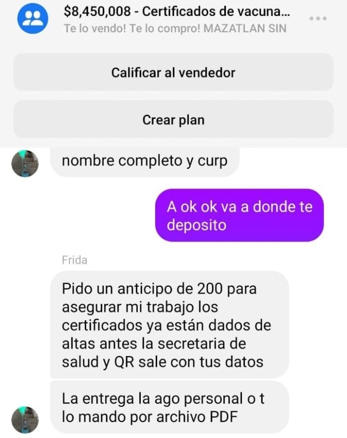 Aunque sólo debería emitirlos el Gobierno federal y son gratuitos para las personas que hayan completado su esquema de inmunización, diferentes usuarios de redes sociales ofrecen a la venta de manera irregular certificados de vacunación contra el COVID-19.El documento lo promueven en espacios como Facebook a un costo de hasta 300 pesos.“Pido un anticipo de 200 para asegurar mi trabajo. Los certificados ya están dados de alta ante la Secretaría de Salud y el QR sale con tus datos. La entrega la hago personal o te lo mando por archivo PDF”, respondió Frida EG, una vendedora en esa red social.Arce Francisco, otro vendedor, escribió que “este servicio es para la gente que le urge salir de viaje a otro país. Se le hace el registro sin necesidad de asistir a la vacuna o simplemente es para personas que no se quieren vacunar”.En el grupo “Santa Mago, Zapopan, Ventas”, lo ofrecen desde 100 pesos. La publicidad remarca: “Sin cita, sin vacuna, sin pagos anticipados”.También hay miembros de la red social que reprueban la acción, tal es el caso de Ale Guerrero quien comentó: “No se debe de expedir un certificado de que estás vacunado, si no lo estás, me parece fraude, muy respetable quien quiera o no vacunarse, pero que asuman las consecuencias como la de no viajar”.El Artículo 243 del Código Penal Federal refiere que la falsificación de documentos públicos se sanciona con hasta 12 años de prisión, además de multa.La página web oficial del Gobierno federal donde se puede obtener legalmente el certificado de vacunación cuando se cuenta con las dosis correspondientes contra el coronavirus es https://cvcovid.salud.gob.mx/ o por WhatsApp al número 56 1713 0557. Es gratuito y el proceso dura tres minutos.MQ