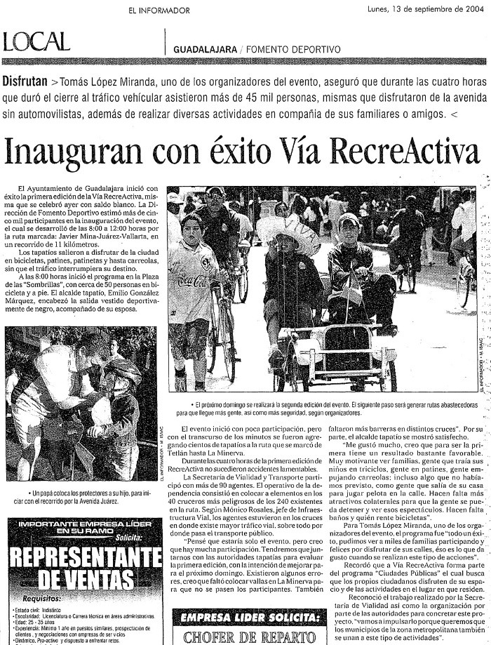 Hace 20 años un grupo de vecinos y empresarios de la Plaza Tapatía buscaban realizar un reglamento de imagen y construcción de la zona para unificar todos los edificios. Para ello tenían un presupuesto de 150 mil pesos, pero el proyecto les costaba 500 mil pesos. Para reunir los recursos pensaron en realizar un evento con un grupo musical pero por algunas razones esto nunca se concretó.En el camino los promotores se encontraron al arquitecto y doctor en Movilidad, Luis Felipe Siqueiros, especialista en Planeación Urbana quien les propuso realizar un proyecto que cambiara la manera de pensar de los tapatíos y hacer una ciudad más unidad y humana.Luis Felipe Siqueiros les recomendó al exalcalde de Bogotá, Enrique Peñalosa para que les ayudará a realizar el proyecto. Peñalosa llegó a Guadalajara el 9 de septiembre del 2003 para conocer la ciudad y ofrecer una serie de conferencias. En sus pláticas, el colombiano recalcaba la belleza del Centro Histórico de Guadalajara, lo bonito del bosque de La Primavera y de la barranca de Huentitán, por lo que sugirió unirlos con un proyecto integrador.“Nos empezó a platicar todo lo que hizo en Bogotá en tres años de alcalde y la decisión fue ir a Colombia a ver los proyectos que había hecho, entre ellos la Ciclovía de Bogotá”, recordó José Palacios Jiménez, promotor del proyecto y presidente de la Fundación GDL 500 (anteriormente, Guadalajara 2020).El 31 de enero del 2004 los promotores tapatíos viajaron a Bogotá para ver la Ciclovía que tiene 120 kilómetros y en la que participan dos millones de personas cada domingo. “Fuimos en bicicleta y vimos todas las actividades que había y como la gente gozaba de este espacio público y fue cuando decidimos replicar este proyecto en Guadalajara”.Fue así que el domingo 12 de septiembre del 2004 se inauguró la Vía RecreActiva de Guadalajara, con una extensión de 11 kilómetros entre la glorieta Minerva y Tetlán.“El objetivo era unir ‘las dos Guadalajaras’ que se decía estaban divididas por la calzada Independencia. El arranque fue justamente por eso de Tetlán a La Minerva”, recordó José Palacios.La primera jornada fue de las 8:00 a las 12:00 horas. “Esperábamos alrededor de cinco mil usuarios y tuvimos 32 mil visitantes el primer día”, recordó con emoción.Con el paso del tiempo, la Vía RecreActiva amplió su horario de las 8:00 horas a las 14:00 horas, además de que crecieron los kilómetros y las rutas.La vía cuenta ahora con 73 kilómetros y tiene diversas rutas en Guadalajara, Zapopan, Tlaquepaque y Tonalá. Se estima que cada domingo asisten más de 300 mil personas a disfrutarla.Además de José Palacios otros impulsores del proyecto fueron Rocío Herrera, Tomás López Miranda y Lucy Barriga. De acuerdo con el entrevistado hay varios retos para mejorar la Vía RecreActiva, como el que se tengan más jóvenes de servicio social que son los que están en los cruceros, también falta que los municipios mantengan los uniformes y colores institucionales de los servidores y mejorar la señalética, además de realizar más actividades alrededor de la misma.José Palacios asegura que la Vía RecreActiva, además de unir a los tapatíos, también ha sido un factor fundamental para la limpieza de la imagen urbana. “Cuando empezamos a sacar las fotos de la vía comenzamos a ver la contaminación visual que teníamos en el mobiliario urbano y los árboles. Entonces logramos también que los municipios aprobaran una iniciativa para prohibir el uso de pendones”, afirmó.