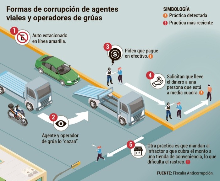 El fiscal Anticorrupción del Estado, Gerardo de la Cruz Tovar, confirmó que hay tres elementos de la Policía Vial identificados por cometer presuntos actos de corrupción en complicidad con operadores de grúas. Precisó que saben sus nombres y los números de identificación de los vehículos oficiales en los que se trasladan. De la Cruz Tovar indicó que dichos oficiales son “los más activos” y por lo tanto ya son investigados para acreditarles hechos denunciados por ciudadanos afectados y a partir de las indagatorias de miembros de la dependencia a su cargo. El funcionario explicó que han detectado que los servidores públicos ahora piden a las personas que depositen en tiendas de conveniencia. Lo hacen a través de pagos tipo STP, una plataforma tecnológica que funciona como una banca externa, lo que dificulta el rastreo de los corruptos. Llamó a las personas para que denuncien estas prácticas (sin consecuencias legales contra quienes lo hagan) en las instalaciones de la Fiscalía Anticorrupción, ubicadas en Amado Aguirre 857, en Jardines Alcalde. También se puede por teléfono a los números 33-1653-7783 y al 33-1653-7784, extensión 301, o en la página de internet fiscaliaanticorrupcion.jalisco.gob.mx/denuncia. “Nosotros no exponemos sus datos, cuidamos la secrecía. El combate a la corrupción nos toca no sólo a las autoridades encargadas de perseguirla, sino también al particular. Porque una cosa es que la persona lo ofrezca y otra que la orillen o presionen a hacerlo”. Reiteró que en la historia de la Fiscalía Anticorrupción se han abierto 175 carpetas de investigación contra oficiales viales, de las cuales hay al menos 50 activas en este momento por actos de corrupción como cohecho o abuso de autoridad. El pasado domingo, este medio de comunicación dio a conocer, una vez más, que la corrupción por parte de estos oficiales con grúas, incluso piratas, persiste, y que se ha extendido a zonas como los alrededores del Parque Metropolitano, La Estancia, Providencia, el Centro Médico de Occidente del IMSS y el Mercado Felipe Ángeles. Por otra parte, De la Cruz Tovar acentuó que la investigación por corrupción en el programa “Salvando Vidas”, en el que se documentó que dos personas libraron el “Torito” al pagar mil pesos (luego de que la conductora salió positiva en la primera prueba de alcoholemia que se le aplicó), se apoyará de videos de negocios cercanos, sean de empresas privadas o del Escudo Urbano C5, para dar con los responsables.