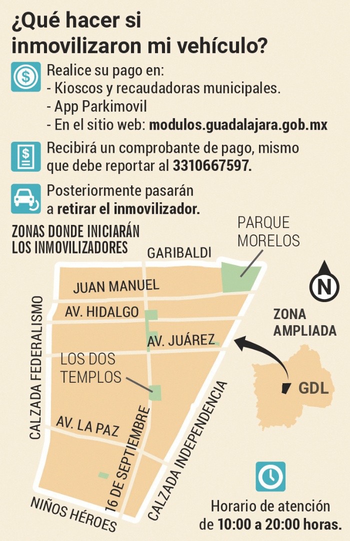A una semana de que comience la colocación de inmovilizadores para los vehículos que reincidan al estacionarse de forma incorrecta en el Centro tapatío, el Ayuntamiento de Guadalajara informó que la multa se podrá pagar en la aplicación Parkimovil, tiendas de conveniencia, recaudadoras municipales o en el sitio modulos.guadalajara.gob.mx. El Gobierno municipal indicó que para que se pueda retirar la “araña”, el infractor deberá desembolsar 415 pesos. Sin embargo, si en 24 horas no los cubre, el coche será retirado con grúa. Además, pese a las labores de socialización con comerciantes, vecinos y visitantes del primer cuadro, los automovilistas aún siguen estacionándose de forma incorrecta. Este medio los observó en raya amarilla, doble fila o invadiendo zonas peatonales. “Está bien porque hay gente que no respeta las rampas o líneas amarillas. Como comerciantes siempre tenemos problemas con los clientes. Algunos se meten al estacionamiento y otros no”, dijo Gaspar Pérez Sánchez.El programa se extenderá desde Federalismo hasta la calzada Independencia, y de Niños Héroes a Garibaldi. Los aparatos se pondrán si el conductor invadió dos cajones de estacionamiento, obstruyó cocheras, zonas peatonales, para personas con discapacidad o de servicios de emergencia. También por quedarse en línea amarilla o en doble fila. Se utilizarán incluso si el automovilista está a bordo del automotor.