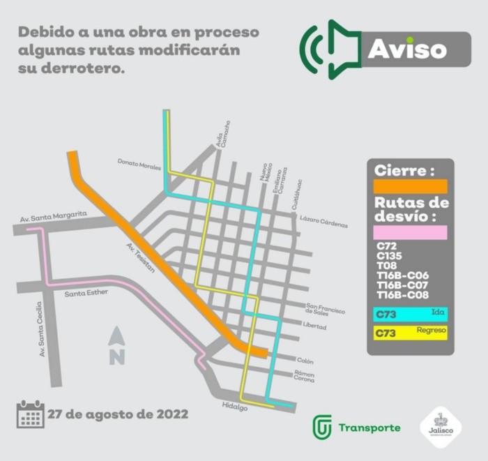 Por las obras en las colonias Balcones de la Cantera de Zapopan y Santa Margarita, nueve rutas del transporte público desviarán su derrotero habitual, esto luego de que este viernes el municipio iniciara con los trabajos de conexión de drenaje pluvial y drenaje sanitario, así como rehabilitación de calles y banquetas.En la colonia Balcones de la Cantera se cerrarán a la circulación las calles Rubí, Brillante de Oro y Diamante de Piedra, entre otras calles aledañas, lo cual generará el desvío de las siguientes rutas desde hoy:La ruta C33, que transita por la calle Abel Salgado Velasco en sentido sur a norte, se desviará por la calle Agua Prieta hasta calle Tezontle y Rubí para continuar por calle Oro hasta llegar a calle Roca y Cantera Morada, donde se incorporará a su derrotero habitual.En sentido norte a sur, por la calle Cantera Morada, se desviará al llegar a la calle Roca hasta las calles Oro y Rubí; ahí tomará calle Tezontle y Agua Prieta hasta Abel Salgado para continuar con su trayecto cotidiano.En el caso de la ruta T07, que circula por la calle Abel Salgado Velasco en sentido de Agua Fría hacia Tabachines, se desviará al llegar a calle Agua Prieta hasta Tezontle y Roca para continuar por Cantera Morada.En sentido inverso, al transitar por Cantera Morada se desviará en calle Roca hasta Tezontle y Agua Prieta para continuar por Abel Salgado Velasco en su recorrido acostumbrado. El segundo desvío de rutas será en la colonia Santa Margarita a partir de mañana sábado 27 de agosto dado el cierre de avenida Tesistán, desde Av. Santa Margarita hasta la calle Emilio Carranza, lo que hace necesario el cambio de derrotero de las siguientes rutas:Las rutas C72, C135, T08, T16B-C06, T16B-C07 y T16B-C08, que circulan por Santa Margarita en su sentido de Periférico hacia Zapopan, se desviarán en Avenida Santa Cecilia hasta Avenida Santa Esther y calle Fray Toribio de Motolinía para luego tomar la calle Constitución y Avenida Hidalgo para continuar su derrotero.De regreso en su sentido de oriente a poniente transitarán por avenida Hidalgo y se desviarán por la calle Constitución hasta Fray Toribio de Motolinía y Santa Esther para continuar por Santa Cecilia hasta llegar a Avenida Santa Margarita y continuar su trayecto cotidiano.A su vez, la ruta C73, que transita por avenida Hidalgo en su sentido oriente a poniente, se desviará por la calle Abasolo hasta Cuitláhuac y Libertad, donde continuará por Nuevo México hasta llegar a Lázaro Cárdenas y terminar su desvío.En sentido inverso, de poniente a oriente, avanzará por Lázaro Cárdenas y se desviará por la calle Donato Morales hasta Avenida Manuel Ávila Camacho y San Francisco de Sales y ahí tomará Emilio Carranza y Allende para tomar Hidalgo y continuar su derrotero.JM