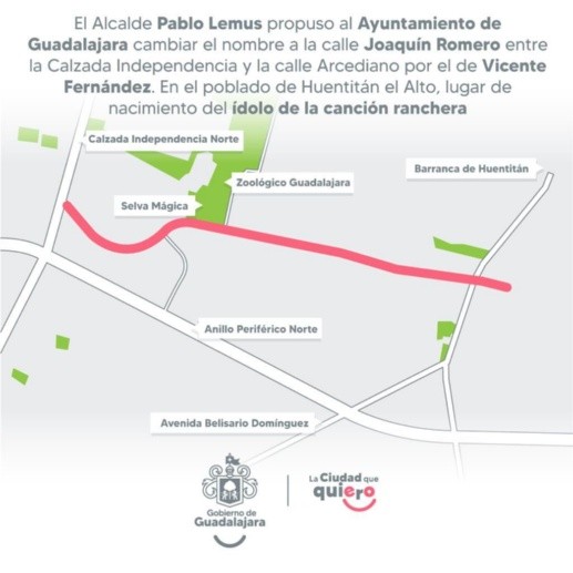 Una vez más en el Ayuntamiento de Guadalajara se discutirá la propuesta de cambiar una calle en honor del recién fallecido, Vicente Fernández Gómez, artista también conocido como “El Charro de Huentitán”.Fue el alcalde tapatío, Pablo Lemus Navarro, quien presentó una iniciativa en Sesión Ordinaria del Ayuntamiento, para analizar la modificación del nombre de la calle Joaquín Romero, también conocida como Paseo del Zoológico para que lleve el nombre de Vicente Fernández, en homenaje a la trayectoria artística de este músico icónico de México.La propuesta es que el cambio de la nomenclatura comprenda el tramo ubicado entre Calzada Independencia y calle Arcediano, llegando a la colonia Huentitán El Alto.“Lo anterior como un reconocimiento público a este personaje oriundo de Huentitán El Alto, poblado perteneciente al municipio de Guadalajara que vio nacer en 1940 a don Vicente Fernández, uno de los personajes más prolíficos que ha dado nuestra ciudad, comparado con Pedro Infante, con Javier Solís, con José Alfredo Jiménez”, expresó Lemus Navarro.La iniciativa, a la cual se sumó la regidora por Morena, Candelaria Ochoa, fue turnada para su análisis y dictaminación a las comisiones edilicias de Cultura, Espectáculos y Festividades Públicas y a Obras Públicas, Planeación del Desarrollo y Movilidad.Esta no es la primera ocasión en la cual se intenta cambiar el nombre de una calle en Guadalajara por el del "Charro de Huentitán". En 2010 el entonces regidor, Gabriel González Delgadillo, propuso cambiar la nomenclatura de Belisario Domínguez, por el de “Don Vicente Fernández”, desde el Anillo Periférico hasta su terminación en la Barranca de Huentitán.Pese a que la iniciativa fue aprobada en abril de 2010, esto no fue aplicado y la misma fue retomada en 2012 por la presidenta de la Comisión de Centro, Barrios Tradicionales y Monumentos, María Luisa Urrea, aunque tampoco se logró el cambio.GC