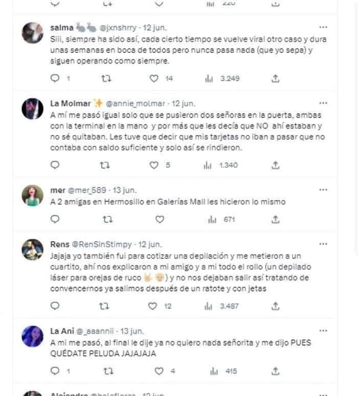 Una mujer se hizo viral luego de que en redes se difundiera un video en el que se ve molesta saliendo de una tienda de lo que parece ser una empresa depilación dentro de una plaza ubicada en Mariano Otero, en la colonia Jardines del Sol, en Zapopan.En la grabación se ve a la mujer discutiendo con alguien en la recepción de dicha empresa y después salir molesta. Ya afuera, en el pasillo de la plaza, grita "son unas impostoras", refiriéndose a la empresa de depilación.Y al final del video dice que tuvieron a su hija ahí en contra de su voluntad.Ese video tiene más de 228 mil reproducciones en TikTok y más de 10 mil comentarios, donde la mayoría de las personas dicen haber vivido lo mismo.Sin embargo, el video tomó relevancia debido al número de personas que se han identificado con la vivencia de la señora con respecto a los supuestos maltratos de la empresa en diferentes sucursales de varios estados del país. Incluso hay quienes señalan que han denunciado ante distintas autoridades como Profeco.Además, son varios los videos de testimonios de mujeres que hablan de que les ocurrió algo similar y tuvieron miedo.En los comentarios del video, algunas usuarias acusan que personal de dicha compañía las retuvo en el lugar y las maltrataron."A mí una vez me metieron, me hicieron estar encerrada 3 horas y no te dejan salir, casi te obligan a pagar algún paquete y cuando les das negativa", escribió Yunuen Ocampo.Mirosloba, por su parte, señaló que "me pasó, fui a preguntar precios y me dejaron encerrada en una habitación como 1 hora, no me iban a dejar salir hasta que pagara algún paquete".Tagariita dijo que "a mi mamá y a mí nos lo hicieron yo trate de abrir la puerta para irnos y llegó otra a cerrármela quitándome la mano de la puerta"."A mí me pasó (en la misma plaza en Zapopan), me metieron a un cuarto para platicarme de sus promociones y cuando les dije que no me quitaron mi cartera agarraron mis tarjetas y empezaron a comprobar si tenía dinero, por suerte no traía ni un peso en ninguna, pero así me tuvieron 2 horas y tuve que suplicarles llorando que me dejaran salir y nomás así me abrieron la puerta y aparte me insultaban", comentó Witchy.