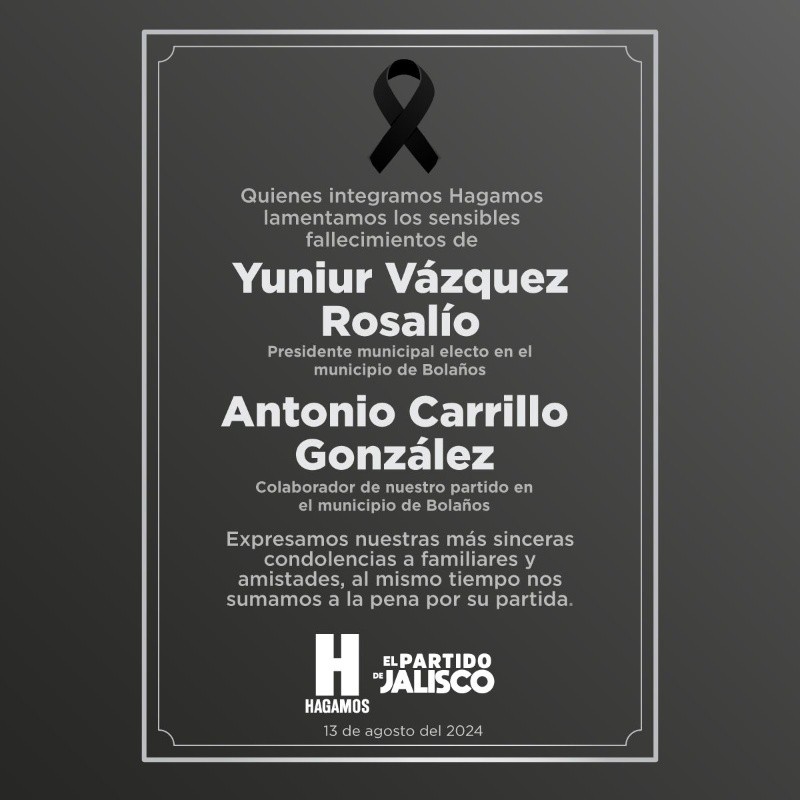 Luego de que la Fiscalía del Estado (FE) localizara esta mañana los cuerpos de dos hombres que se presumía podrían ser Yuniur Vázquez Rosalío, Presidente municipal electo del municipio de Bolaños, y Antonio Carrillo González, su coordinador de campaña, el partido político Hagamos confirmó la muerte del edil y su colaborador.Con información preliminar, la FE señaló que “los rasgos y prendas coinciden con el presidente electo del municipio de Bolaños,Yuniur Vázquez Rosalío, y su acompañante, António Carrillo González”.Fue esta tarde que Hagamos confirmó el fallecimiento del alcalde, quien desapareció el 10 de agosto en el municipio de Colotlán, luego de que regresara de un viaje de la Ciudad de México junto con Carrillo González.El vehículo donde elementos de la Fiscalía encontraron los cuerpos de las víctimas fue localizado en la Carretera Villa Guerrero - Bolaños, en el tramo estatal 701, kilómetro 17 900.El gobernador del estado dio a conocer el día de ayer que el edil electo no llegó a su domicilio, aunque aún no se presentaba ninguna denuncia por desaparición.Desde la localización de los cadáveres, personal de distintas corporaciones trabajan en la zona en las labores de extracción de los cuerpos. YC