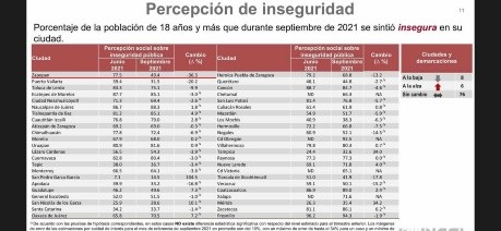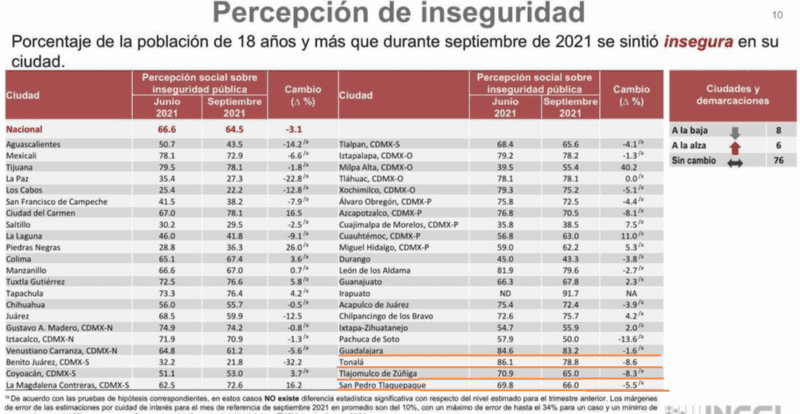 La percepción de inseguridad entre los habitantes del municipio de Zapopan disminuyó más de 30 por ciento durante el mes de septiembre, según reveló encuesta nacional de seguridad urbana. En el estudio, se reveló que el 49.4 por ciento de la población de 18 años y más que habita en Zapopan percibe que el municipio es inseguro durante el mes pasado, casi 40 puntos menos que la cifra registrada en el mes de junio, cuando la percepción de inseguridad entre los ciudadanos era del 77.5 por ciento. Se trata de la primera vez que este indicador está por debajo del 50 por ciento en el municipio.Asimismo, otros de los municipios de la Zona Metropolitana de Guadalajara (ZMG) también registraron una disminución, aunque fue mínima. Guadalajara, por ejemplo, durante el mes de septiembre tuvo una percepción de inseguridad entre sus ciudadanos de 83.2 por ciento, 1.6 por ciento menos que la reportada en junio, que fue de 84.6 por ciento. Tonalá, por su parte, registró una disminución de 8.6 por ciento, pues en septiembre 78.8 por ciento de su población manifestó sentirse insegura, en comparación con el 86.1 por ciento de junio del mismo año. Tlajomulco reportó una disminución similar con 8.3 por ciento, ya que durante el mes pasado, la percepción de inseguridad entre los ciudadanos fue de 65 por ciento, mientras que en junio se registró 70.9 por ciento. Finalmente, Tlaquepaque, que en los últimos días ha registrado varios homicidios, tuvo una disminución del 5.5 por ciento, pues registró 66 por ciento, cuando en junio fue de 69.8 por ciento.GC