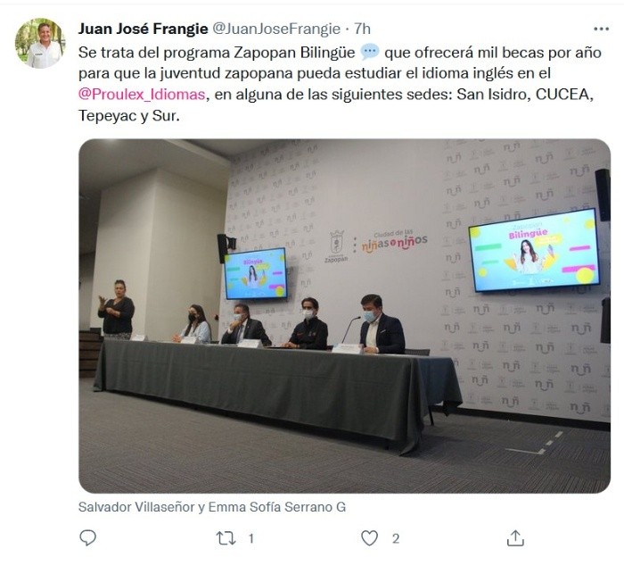 Con la finalidad de fomentar el aprendizaje del idioma inglés, el Gobierno de Zapopan, en colaboración con el centro de idiomas Proulex, presentó el programa de becas “Zapopan Bilingüe”.Se trata apoyos educativos que promueve el Gobierno Municipal que serán destinados a zapopanas y zapopanos entre los ocho y los 25 años de edad que estén interesados en el estudio de esta lengua extranjera, la cual además busca fortalecer las habilidades de la juventud para el emprendimiento y el autoempleo.“Es una gran oportunidad porque esto les va a permitir abrir una puerta, es una llave para tener un idioma más. Es una llave que va a darles facilidades para que tengan un trabajo, además, en un nivel mucho más alto del que pueden encontrar en otro lado”, expresó el alcalde de Zapopan, Juan José Frangie.“Zapopan Bilingüe” forma parte de la estrategia de desarrollo educativo del municipio y se suma a programas como “Beca Zapopan” y “Mi Estancia Zapopan” en beneficio de las y los jóvenes.El coordinador general de Desarrollo Económico y Combate a la Desigualdad, Salvador Villaseñor, destacó que este programa forma parte de una iniciativa única a nivel nacional que colocará a Zapopan como referente en el fomento de un segundo idioma.Con una inversión de tres millones de pesos, el Gobierno Municipal de Zapopan ofrecerá mil becas por año durante los próximos tres años. Cada una de ellas consiste en la ayuda de 100% por alumno para cubrir el pago total del curso en el Proulex. Estos apoyos se entregarán de acuerdo con la convocatoria y con base en los requisitos.“No solamente la iniciativa es positiva académicamente hablando, sino también por el impacto social que esto representa, dado que se está dirigiendo a las edades tempranas en las que, pedagógicamente hablando, son las más factibles para que un dominio de idioma, ya sea segundo o tercer idioma, pueda aprenderse con mayor facilidad y efectividad”, expresó el director general general del Proulex, Edwin Belo Ramírez.La duración académica es de nueve meses e incluye todos los niveles de enseñanza que dispone Proulex. Las y los interesados podrán registrarse en la página creditozapopan.com.JM