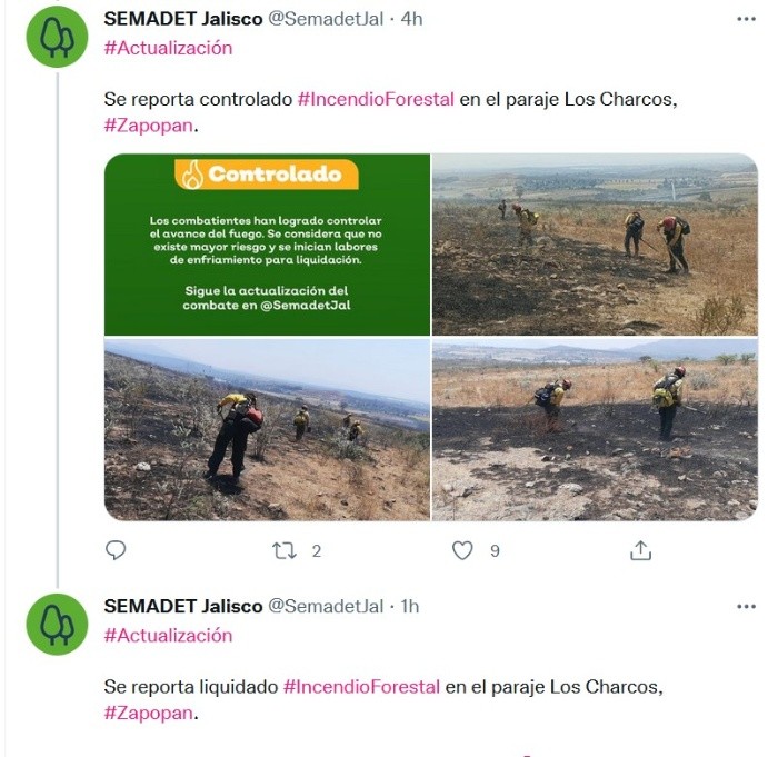 Una superficie de 26.3 hectáreas aproximadamente fue la afectación de un incendio de solamente hojarasca y pasto en el predio Los Charcos de Zapopan, cercano a las instalaciones del Club Deportivo de la Universidad de Guadalajara.Según información de la Secretaría de Medio Ambiente y Desarrollo Territorial del Estado de Jalisco (Semadet), el incendió comenzó a las 13:30 horas en el paraje mencionado, ubicado en la división de la autopista Guadalajara-Tepic y la carretera Tala-Ameca.A las 19:00 horas, la Semadet informó que el incendio había sido liquidado. En total atendieron 32 brigadistas de diferentes corporaciones como Semadet, Organismo Público Descentralizado (OPD) Bosque La Primavera, Bomberos de Zapopan y con el apoyo aéreo de los helicópteros Witari y Tlaloc.No hubo rescatistas lesionados, ni riesgo de propagación a zonas residenciales.JM