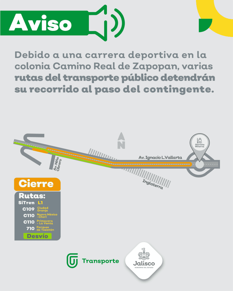 Con motivo de la "4ta Carrera la Meta es la Educación" que se llevará a cabo el domingo 14 de mayo a partir de las 7 de la mañana en la Colonia Camino Real de Zapopan, algunas rutas del transporte público modificarán ligeramente su recorrido mientras pasa el contingente de corredores.El punto de salida y meta de la carrera será a un costado del Hard Rock Guadalajara Iconia Cubos en la lateral de Av. Vallarta; los participantes saldrán por la lateral de Av. Vallarta frente a Hard Rock, hacia el oriente, en el sentido de la circulación vehicular; se incorporarán a carriles centrales a la altura de la calle El Carmen y continuarán en dirección hacia la Minerva, darán vuelta en "u" en Aurelio Aceves, continuarán por los carriles centrales de Av. Vallarta y seguirán por esta hacia el poniente hasta llegar a la meta, en el mismo sitio de salida.En su recorrido de ida sobre la Calzada Lázaro Cárdenas, se desviarán hacia la Av. Niño Obrero hasta retomar su derrotero habitual en la lateral de Av. Ignacio L. Vallarta; de regreso no se modifica su derrotero.OF