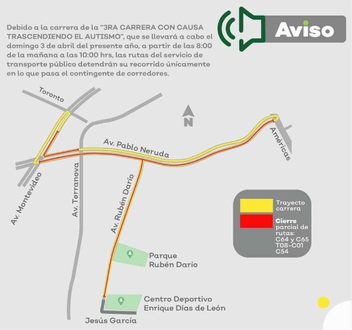 Mientras pasan los participantes de la "3ra carrera con Causa Trascendiendo el Autismo", las rutas T08-C01, C54, C64 y C65 detendrán su recorrido este domingo 3 de abril de las 8:00 a las 10:00 horas, informó el gobierno de Jalisco.Dicha competencia se desarrollará en corredores viales importantes de la cabecera municipal de Zapopan, por lo que al paso del mismo en las vías que a continuación se enlistan, las rutas detendrán su recorrido de forma momentánea:Se recomienda a los usuarios tomar las previsiones necesarias en sus traslados.OF