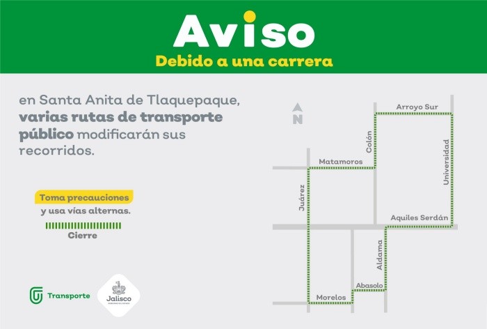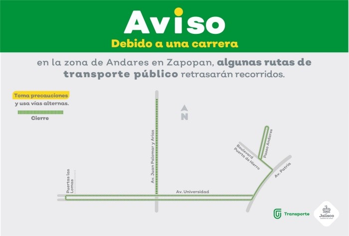 La Secretaría de Transporte de Jalisco, informó que este domingo 18 de febrero debido a dos carreras deportivas en los municipios de Zapopan y Tlaquepaque, varias rutas del transporte público detendrán su recorrido únicamente mientras pasan las personas participantes de dichos eventos. En el municipio de Zapopan la carrera empezará a las 6:30 horas y tendrá como punto de salida la calle Paseo Andares, a la altura de la glorieta de la escultura "Anhelos".Los corredores seguirán el sentido de la circulación por boulevard Puerta de Hierro, al llegar a la avenida Patria girará a la derecha hasta la avenida Universidad, donde dará vuelta a la derecha, llegará a la avenida Juan Palomar y Arias.Además, en su recorrido en Juan Palomar y Arias los corredores girarán a la derecha y a la altura del fraccionamiento La Ceiba se retornarán por la misma vía nuevamente hasta la avenida Universidad.Después se prevé que darán vuelta a la derecha hasta llegar a la avenida Paseo Puerta Las Lomas donde se retornarán hasta la avenida Patria, girarán a la izquierda de regreso hacia Andares, darán vuelta para continuar por boulevard Puerta de Hierro, seguirán por Paseo Andares hasta encontrarse con la meta.Las rutas de camiones que se detendrán en el tiempo en el que avanzan las y los participantes son: En la avenida Patria en el sentido de norte a sur, entre boulevard Puerta de Hierro y la avenida Universidad, pausarán las rutas C120, C121A, C121B, C136, C43 Arco del Triunfo, C54, C71, T17, T17-1, T17-C01 y 710 Parques de Tesistán.Por su parte, las rutas C71 y C138 se detendrán en avenida Universidad, en sentido oriente a poniente, entre avenida Patria y Paseo Puerta Las Lomas.La carrera del municipio de Tlaquepaque tendrá como punto de partida la calle Universidad, a un costado de la Preparatoria Regional de Santa Anita, a partir de las 8:00 horas, con el siguiente recorrido:Las y los corredores saldrán en dirección hacia el norte, al llegar a la calle Arroyo Sur girará a la izquierda para seguir al sur por la calle Colón, en la calle Matamoros girará a la derecha hasta Juárez.Después, en esta última los participantes darán vuelta a la derecha, continuarán en Morelos, darán vuelta nuevamente a la izquierda hasta llegar a Abasolo, seguirán por Aldama hasta Aquiles Serdán para continuar nuevamente en la avenida Universidad hasta encontrarse con la meta.Las rutas del transporte público que en la calle Morelos detendrán su recorrido mientras pasan los corredores serán la C128A-V1 y C133 Balcones, mientras que en la calle Abasolo lo hará la ruta MP-A05 de Mi Macro Periférico.Finalmente, la ruta C128A V2 será la única que modificará, de manera momentánea, únicamente en su trayecto de ida, pues al circular por la calle Colón, continuará por Aquiles Serdán para retomar su recorrido habitual.NA