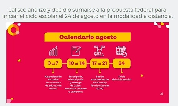 Los niveles de educación básica en Jalisco regresarán a clases en la modalidad "a distancia" el día 24 de agosto.El gobernador de Jalisco anunció que tras analizar la propuesta de la Secretaría de Educación Pública para el regreso a clases decidieron sumarse a la estrategia."No habrá clases presenciales, esa es una definición ya tomada y que no se va a modificar en las próximas semanas, hasta que la Mesa de Educación y la Mesa de Salud presenten los indicadores que nos permitirán decir cuándo hay condiciones para regresar a clases", dijo el gobernador de Jalisco al presentar la adaptación al calendario escolar en Jalisco.La fecha establecida para retomar las actividades escolares, representa una modificación de una semana posterior respecto al plan original presentado a finales de junio.Juan Carlos Miramontes, titular de la Secretaría de Educación Jalisco, informó que será en la primera semana del ciclo escolar cuando se les informe a los alumnos y padres de familia los recursos que se utilizarán para la modalidad a distancia, tales como: Televisión, fichas o guías didácticas, material impreso, radio y plataformas digitales."Les pido que todos hagamos un esfuerzo muy significativo para estar en contacto con la escuela", expresó el titular de Educación en Jalisco y explicó que además de correo electrónico y teléfono celular con grupos de WhatsApp cuya organización define cada escuela, se está considerando la posibilidad de brindar asesoría presencial en la escuela a los alumnos que lo requieran.Sobre las asesorías presenciales, Miramontes explicó que esta modalidad es opcional y será de común acuerdo entre las escuelas y los padres de familia para concertar una cita y poder brindar el apoyo.Para las reinscripciones, el secretario de Educación Jalisco informó que en grados intermedios serán automáticas, pero para aquellos que recién ingresan o cambiaron sus domicilios será el proceso en las escuelas directamente.El proceso será del 10 al 14 de agosto. En esa fecha también se hará entrega de útiles, mochilas, uniformes y calzado.Además, Flores Miramontes indicó que hay espacio suficiente para aquellos alumnos que saldrán de colegios privados para ingresar a escuelas públicas, sin embargo no será necesariamente en las escuelas ubicadas en los lugares con mayor densidad de población, sino en las más alejadas.Para saber cuáles escuelas cuentan con espacios disponibles, los padres de familia pueden ingresar a la página de Recrea Digital.También informó que será a partir del 24 de agosto cuando comiencen a distribuir los libros de texto.Quienes no cuenten con televisión e internet obtendrán materiales exclusivos con ayuda de la Comisión Nacional de Libros de Texto Gratuitos (Conaliteg).“Aunque inicie (clases) a distancia, confío en terminar de manera presencial”, expresó el gobernador.