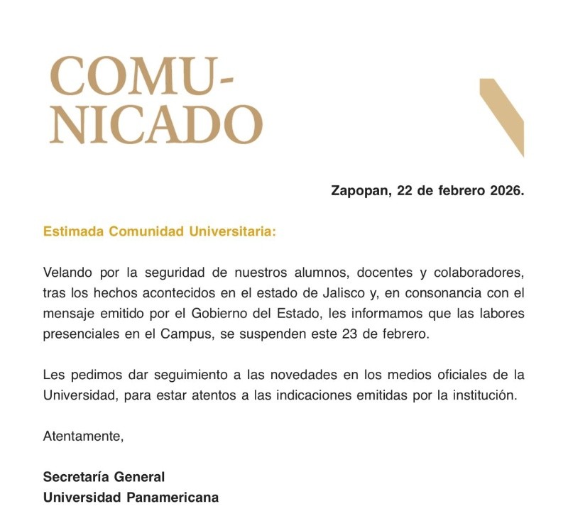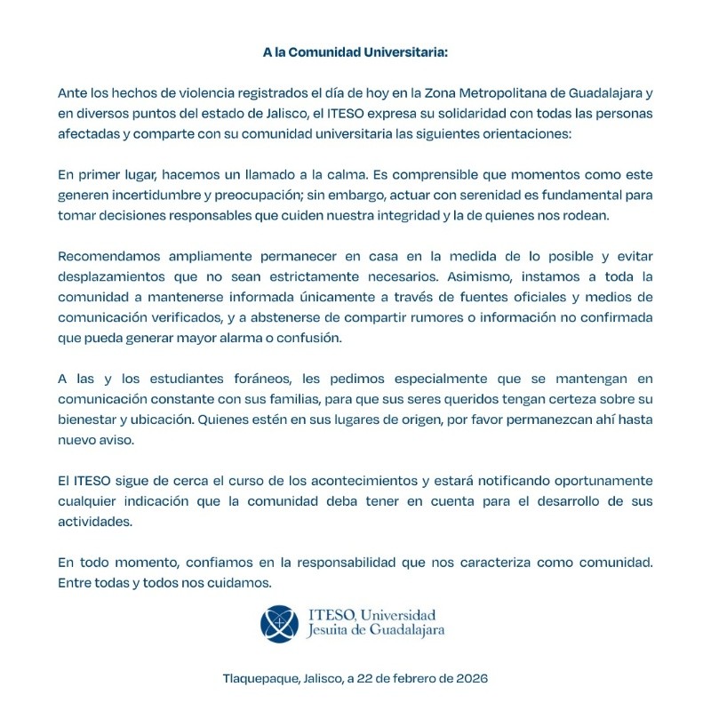 Instituciones de educación media superior y superior en Jalisco anunciaron la suspensión de clases y actividades presenciales para este lunes 23 de febrero de 2026, como medida preventiva ante los hechos de violencia registrados en distintas zonas del Estado.La Universidad de Guadalajara (UdeG) informó que, tras mantenerse en comunicación constante con las autoridades, se determinó suspender todas las actividades académicas y administrativas de la jornada. “La medida busca priorizar la seguridad de la comunidad universitaria y evitar traslados mientras continúan las labores de las autoridades y se monitorea la situación en la entidad”, señaló la institución. Por su parte, la Universidad del Valle de Atemajac (UNIVA) dio a conocer que todas las actividades administrativas se realizarán en modalidad virtual en todos sus niveles educativos, con el objetivo de garantizar la continuidad académica sin poner en riesgo al personal ni al alumnado. El ITESO exhortó a su comunidad a mantener la calma y, especialmente, a los estudiantes foráneos, a mantenerse en contacto con sus familiares en sus lugares de origen para informar sobre su estado. De igual forma, la Universidad Panamericana Guadalajara (UP) anunció la suspensión de labores presenciales en su campus. “Velando por la seguridad de nuestros alumnos, docentes y colaboradores, y en consonancia con el mensaje emitido por el Gobierno del Estado, informamos que las actividades presenciales se suspenden este 23 de febrero”, señaló en un comunicado. Las instituciones coincidieron en que la medida busca proteger la integridad de estudiantes, docentes y personal administrativo, e hicieron un llamado a mantenerse informados exclusivamente a través de medios y canales oficiales para conocer las indicaciones sobre la reanudación de actividades. EE