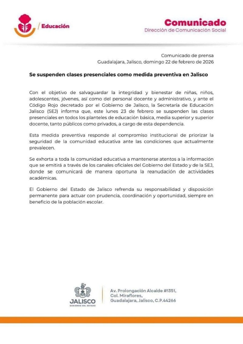 La Secretaría de Educación Jalisco (SEJ) informó la suspensión de clases presenciales en todos los planteles de educación básica, media superior y superior docente —tanto públicos como privados— este lunes 23 de febrero, como medida preventiva ante el Código Rojo decretado por el Gobierno del Estado de Jalisco.La dependencia señaló que la decisión tiene como propósito salvaguardar la integridad y el bienestar de niñas, niños, adolescentes, jóvenes, así como del personal docente y administrativo, en respuesta a las condiciones de seguridad que prevalecen en distintas zonas de la entidad.La SEJ subrayó que esta medida preventiva refleja el compromiso institucional de priorizar la seguridad de la comunidad educativa. Además, exhortó a madres, padres, tutores y personal escolar a mantenerse atentos a la información que se difunda a través de los canales oficiales del Gobierno de Jalisco y de la propia Secretaría, donde se comunicará de manera oportuna la reanudación de actividades académicas.Por su parte, el Gobernador Pablo Lemus Navarro reiteró que la suspensión busca proteger a la población escolar ante los recientes hechos registrados en el estado y pidió a la ciudadanía mantenerse informada únicamente por medios oficiales.“El Gobierno del Estado de Jalisco refrenda su responsabilidad y disposición permanente para actuar con prudencia, coordinación y oportunidad, siempre en beneficio de la población escolar”, puntualizó la dependencia.Hasta el momento, las autoridades educativas no han precisado si las actividades se retomarán el martes, por lo que se recomienda a la comunidad escolar permanecer atenta a los comunicados oficiales emitidos durante las próximas horas. EE
