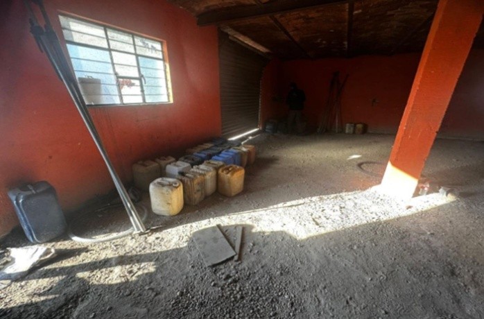 Elementos de la FGR y la Guardia Nacional llevaron a cabo un cateo en las dos fincas donde aseguraron 116 bidones que contenían mil 979 litros de hidrocarburo.