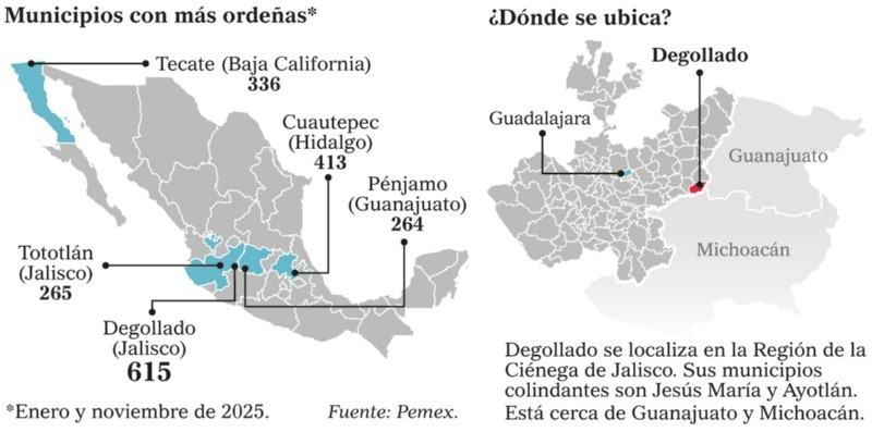 Ni el endurecimiento de penas ni la retórica oficial contra el robo de combustibles han logrado contener el huachicol. Degollado, un municipio de 20 mil habitantes en la Región de la Ciénega de Jalisco, se ha convertido en el municipio con mayor incidencia de ordeñas de combustible en todo México, superando incluso a localidades de Hidalgo, identificado como el principal foco de este delito.Datos de Petróleos Mexicanos (Pemex) revelan que durante los primeros 11 meses de 2025 -el corte más reciente disponible- fueron localizadas 615 tomas clandestinas en Degollado. La cifra resulta inédita a nivel nacional y coloca al municipio jalisciense en el primer lugar del país en hallazgos de piquetes a ductos, pese a que desde años atrás el robo de hidrocarburos fue tipificado como delito grave.Lejos de disminuir, el problema se mantiene y se reproduce. Registros de boletines de la Fiscalía General de la República (FGR) indican que tan solo en lo que va de 2026 se han detectado y asegurado al menos 44 ordeñas de combustible en este municipio, ubicado en una zona estratégica por su cercanía con Michoacán y Guanajuato, y atravesado por el poliducto Salamanca-Guadalajara.Para especialistas en seguridad, el origen del fenómeno no está en la falta de leyes, sino en la corrupción y la ausencia de autoridad efectiva. Francisco Jiménez Reynoso, académico de la Universidad de Guadalajara, advierte que existe un patrón de descuido institucional y una posible complicidad entre autoridades. “Las autoridades municipales son las primeras responsables de vigilar su territorio. Si no hay presencia policial ni supervisión adecuada, claramente no están haciendo su trabajo”.El experto también apunta a un conocimiento profundo del entorno local por parte de quienes operan las ordeñas, lo que sugiere la participación pasiva o activa de pobladores. “Extraer combustible de un poliducto de esta magnitud requiere logística, tiempo y protección; eso no ocurre sin que alguien vea y calle”.Arturo Villarreal, investigador del Departamento de Derecho Público de la UdeG, explicó que la situación de Degollado se agrava por factores geográficos. A diferencia de otros municipios por donde también cruza el poliducto, en esta zona predominan áreas rurales de difícil cobertura, lo que facilita la extracción, el ocultamiento y la distribución del combustible robado hacia Estados vecinos. “Es un punto estratégicamente desprotegido y con salidas inmediatas a mercados ilegales”.A ello se suma la impunidad. En ninguno de los casos reportados por la Fiscalía General de la República en 2026 se ha informado de personas detenidas. Para Rubén Ortega, especialista en seguridad, esto evidencia la ausencia de inteligencia y seguimiento. “Si no hay detenidos, es porque no hay investigaciones profundas. Las penas más altas no sirven si no se aplica la ley”.En días recientes, el gobernador Pablo Lemus anunció el despliegue de operativos especiales y el uso de tecnología como drones para reforzar la vigilancia, así como la supervisión de puntos de venta para identificar la cadena de comercialización del combustible ilegal. Sin embargo, especialistas coinciden en que sin coordinación real entre autoridades municipales, estatales y federales, el huachicol seguirá intacto.Solo en el primer semestre de 2025, el robo de combustible generó pérdidas superiores a los 13 mil millones de pesos para Pemex. Los hallazgos de tomas clandestinas de hidrocarburo en el municipio de Degollado continúan registrándose durante los primeros días de 2026, sin que se observe una disminución en esta actividad ilícita. Registros de boletines emitidos por la Fiscalía General de la República (FGR) en Jalisco indican que, en lo que va del año, se han detectado y asegurado 44 ordeñas de combustible en este municipio, ubicado en la zona limítrofe con los estados de Michoacán y Guanajuato.El caso más reciente fue reportado el pasado 22 de enero, cuando personal de Seguridad Física de Petróleos Mexicanos (Pemex) denunció ante el fiscal federal en la entidad la localización de seis tomas clandestinas de hidrocarburo. Estas se encontraban en el kilómetro 110+466 del poliducto Salamanca-Guadalajara, en las inmediaciones del poblado Los Fresnos, dentro del territorio de Degollado.Ese mismo día, la FGR en Jalisco informó que elementos de la Secretaría de la Defensa Nacional localizaron un vehículo y dos contenedores abandonados que contenían aproximadamente 8 mil 500 litros de hidrocarburo. El hallazgo se registró en la comunidad de Pozo Seco, también perteneciente al municipio de Degollado, como parte de los recorridos de vigilancia realizados en la zona.Otro aseguramiento similar fue reportado el 26 de enero, cuando integrantes del Ejército Mexicano localizaron alrededor de 8 mil litros de hidrocarburo en la comunidad de Buenavista de Garnica. En ambos casos, el combustible y los objetos asegurados quedaron a disposición del Ministerio Público Federal para la integración de las carpetas de investigación correspondientes.Este medio ha documentado que Degollado encabezó la lista de municipios con mayor número de hallazgos de ordeñas de combustible a nivel nacional, al acumular 774 tomas clandestinas de hidrocarburo detectadas entre enero de 2024 y junio de 2025. Estas cifras colocaron al municipio como el principal foco de detección de tomas clandestinas en el país durante ese periodo.De acuerdo con esos registros, Degollado superó a municipios con alta incidencia histórica de robo de combustible, como Cuautepec de Hinojosa, en Hidalgo; Tecate, en Baja California; Pénjamo, en Guanajuato, así como Tototlán, también en Jalisco. Este escenario implica que Jalisco concentra dos de los cinco municipios con mayor robo de combustible a nivel nacional, una situación que contrasta con la registrada hace una década, cuando los principales focos de esta actividad ilícita en la entidad s