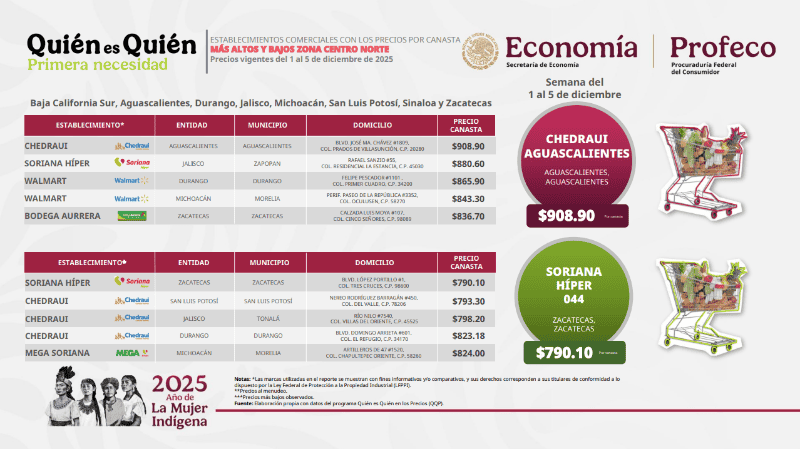 De acuerdo con la actualización realizada hoy lunes 15 de diciembre al programa Quién es Quién en los precios de la Canasta Básica realizado por la Procuraduría Federal del Consumidor (Profeco), Jalisco cuenta con uno de los supermercados más baratos de la región zona centro del país. Para el caso de nuestro estado, la comparativa se realiza junto a territorios como Baja California Sur, Aguascalientes, Durango, Michoacán, San Luis Potosí, Sinaloa y Zacatecas. El monitoreo se realizó del 1 al 5 de diciembre.El precio de la Canasta Básica en dicho periodo osciló entre un máximo de $950 pesos y un mínimo cercano a los $750 pesos. El límite acordado por parte de la Profeco es de $910 pesos para los 24 productos.Cabe destacar que las cantidades que integran la Canasta Básica se calcularon considerando el consumo semanal de un hogar de 4 integrantes, con base en los hallazgos del Censo de Población y Vivienda 2020 publicado por el Instituto Nacional de Geografía y Estadística (Inegi), dividiendo la cantidad total de habitantes entre los hogares censales (126’014,024 habitantes/35’219,141 hogares censales).El Chedraui ubicado sobre avenida Ríop Nilo #7540 en la colonia Villas del Oriente en Tonalá es el supermercado más económico de Jalisco por segunda semana consecutiva. El precio ofertado para los 24 productos de la Canasta Básica fue de $798.20 pesos. Con ello se convirtió en el establecimiento con el precio más bajo no solo del estado, sino de toda la región centro norte de la república.El precio más bajo registrado esta semana en la Profeco para adquirir la Canasta Básica fue $751.30 pesos. El establecimiento que ofreció dicho monto fue el Chedraui en Campeche, Campeche.* * * Mantente al día con las noticias, únete a nuestro canal de WhatsApp * * *OB