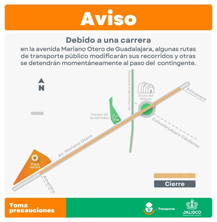 La Secretaría de Transporte Jalisco informó que el próximo domingo 21 de diciembre algunas rutas de camiones pararán y otras modificarán sus recorridos a partir de las 6:30 de la mañana en el municipio de Guadalajara, con motivo de una carrera deportiva.