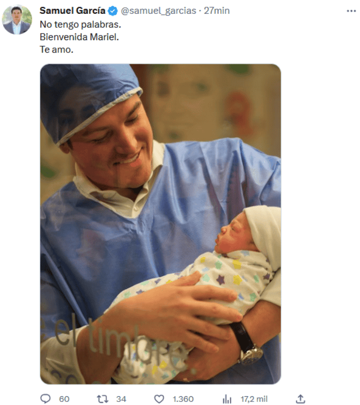 Samuel García y Mariana Rodríguez ya son padres. Fue la madrugada de este viernes que su hija Mariel llegó al mundo. Fue la misma Mariana Rodríguez, esposa del gobernador de Nuevo León, quien dio a conocer la noticia a través de sus redes sociales. Detalló que la bebé Mariel nació esta madrugada a las 03:50 horas."Mariel García Rodríguez 10 de Marzo de 2023 3:52 am", escribió en Instagram junto a una foto de ambos con la bebé.También en los reels de Instagram compartieron videos y fotos de antes y después del parto, entre estas, algunas imágenes del gobernador cargando a la pequeña en el área de cuneros.En otras imágenes se observa como trasladan en camilla a Mariana Rodríguez a otro cuarto donde llevará su recuperación después de parto.Horas antes del parto, la también influencer compartió varios reels para documentar desde que inició con contracciones e imágenes del gobernador que mostraba signos de asombro y nervios."¿Qué sientes, estás contento?", cuestionó la influencer al mandatario en otra historia, quien solo levantó los hombros y calificó el hecho como "un milagro", ya que al mismo tiempo que se prepara para recibir a su hija comenzó a chispear, luego de la sequía por la que atraviesa el estado."No me lo vas a creer, pero está chispeando, te lo juro", mencionó."¿Ya vez? Se tenía que llamar Lluvia García Rodríguez", contestó Rodríguez Cantú.Además de sus historias, Mariana Rodríguez compartió una foto donde se ve a ambos acostados en la cama del hospital.OA