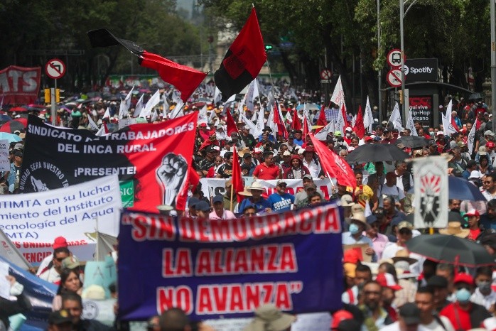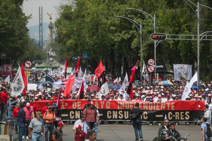 Sindicatos independientes organizaron este lunes una marcha por el Día del Trabajo para denunciar que aún falta democracia sindical en México, conquistar derechos laborales y cumplir demandas laborales.Los trabajadores marcharon para exhibir la incertidumbre, desigualdad económica, el conflicto y la ruptura social que existe en el país.Con consignas como "¡Unidad! ¡Unidad" y "¡El pueblo unido jamás será vencido!", los manifestantes, encabezados por varios líderes sindicales, iniciaron su recorrido desde el emblemático Ángel de la Independencia con el objetivo de llegar al Monumento a la Revolución.Los trabajadores se unieron para protestar en contra del capitalismo, los gobiernos neoliberales y las nuevas formas de corporativismo.En un manifiesto firmado por la Nueva Central de las y los Trabajadores de México, la organización criticó que los gobiernos neoliberales en el mundo "están desplegando una brutal ofensiva" en contra de la clase trabajadora al imponer reformas antipopulares.Expusieron la situación de Francia, donde el Gobierno de Emmanuel Macron aumentó los años de trabajo y cotización para poder pensionarse en ese país.Asimismo, recordaron que hay protestas obreras en Inglaterra, Alemania, España, Grecia y Portugal "que están poniendo en jaque a las democracias burguesas".En América Latina, abundaron, la movilización social busca contener la continuidad neoliberal y profundizar los cambios económicos y sociales en los países donde gobierna el progresismo."Desde México queremos expresar nuestra solidaridad militante con todos estos procesos de lucha obrera y popular que están cimbrando las estructuras de dominación burguesas en todo el mundo", enfatizaron.Afirmaron que este día las demandas son universales, como la reducción de la jornada de trabajo, renta básica universal, defensa de regímenes solidarios de pensiones, derecho a huelga, libertad sindical y contratación colectiva.Señalaron que en México la situación de la clase obrera no es tan diferente como la de otros países."La reforma de la libertad sindical de 2019, del outsourcing del 2021 y los consecutivos incrementos al salario mínimo no han revertido en su totalidad el proceso de precarización del trabajo", criticaron.Afirmaron que son políticas que no buscan revertir las políticas neoliberales, y señalaron que la aprobación de algunas leyes no tuvieron en cuenta las demandas de los movimientos sociales.Reprocharon que no se han resuelto las demandas de organizaciones como el Sindicato Mexicano de Electricistas ni el de la Agencia de Noticias del Estado Mexicano (Notimex), pese a que éste último lleva ya tres años en huelga.También demandaron el reconocimiento a los derechos de sindicatos, de aquellos que buscan la firma de su contrato colectivo y el reconocimiento a los derechos laborales de las y los trabajadores."Demandamos para los trabajadores agrícolas salarios justos, mejores condiciones de trabajo y seguridad social. ¡Alto a la sobreexplotación y discriminación de la que son objeto!", enfatizaron.Dijeron apoyar causas sociales como las luchas de los pueblos originarios que defienden sus recursos naturales frente a empresas trasnacionales y megaproyectos.Expresaron su apoyo en la demanda de reducción de las brechas de desigualdad, contratación con estabilidad, mejores oportunidades para el acceso, permanencia y ascenso en el empleo y ambientes laborales libres de violencia.Finalmente, informaron que convocarán a un diálogo nacional a través de una Convención Nacional Democrática de las y los trabajadores que contribuya a la reorganización de la clase trabajadora que dote de una plataforma de lucha "anti sistémica y reivindicativa".JM