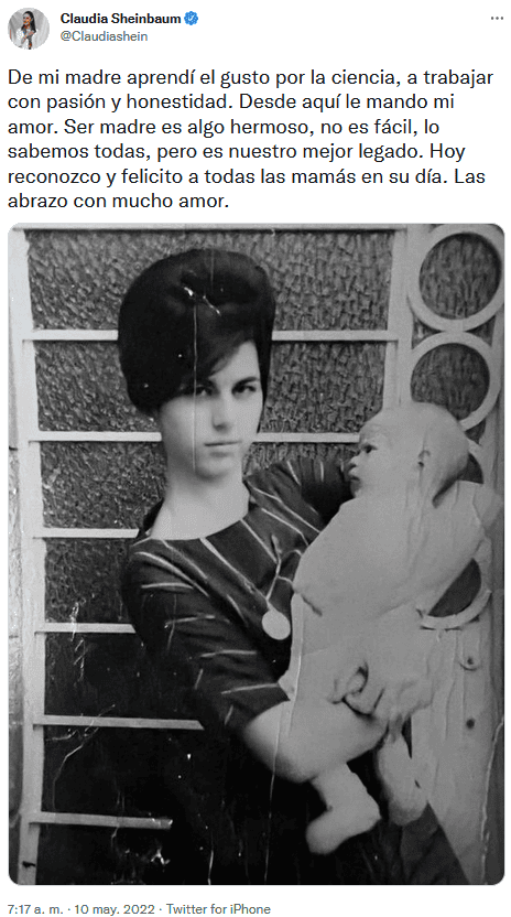 La jefa de Gobierno de la Ciudad de México, Claudia Sheinbaum, felicitó a todas las mamás en este 10 de mayo, donde destacó el significado de ser madre.A través de su redes sociales, la mandataria capitalina dijo que de su madre aprendió el gusto por la ciencia, a trabajar con pasión y honestidad."Ser madre es algo hermoso, no es fácil, lo sabemos todas, pero es nuestro mejor legado", escribió Sheinbaum Pardo.La publicación la acompañó con una imagen donde aparece su madre."Hoy reconozco y felicito a todas las mamás en su día".OA