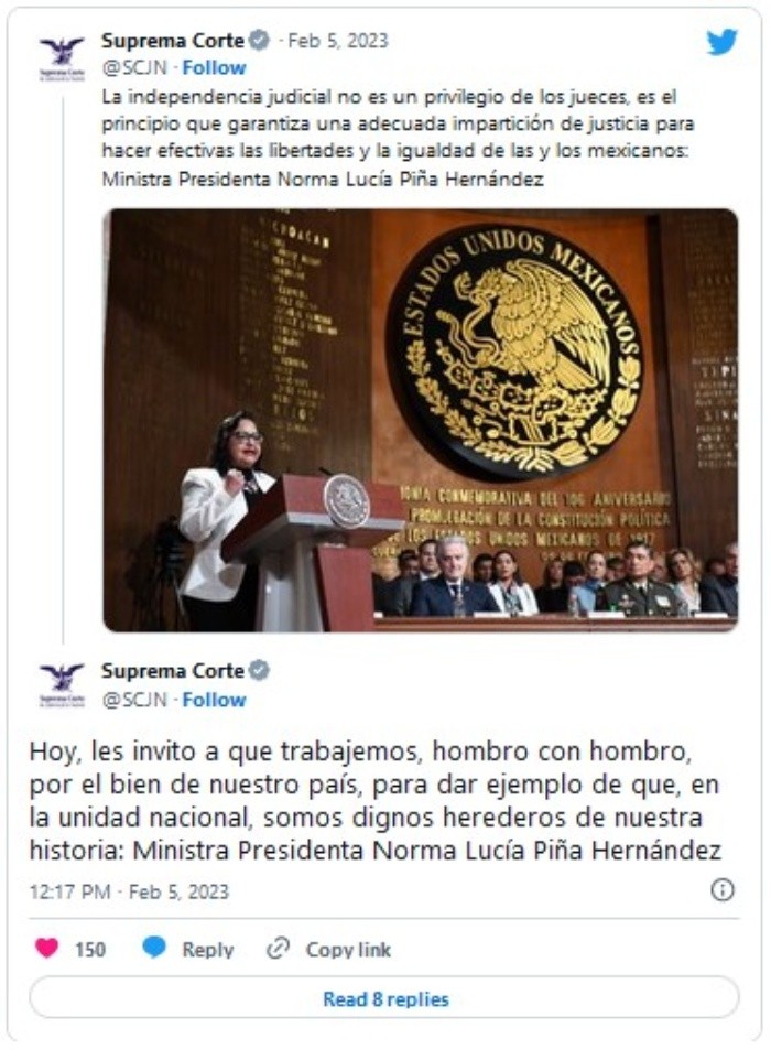 El Presidente Andrés Manuel López Obrador afirmó que insistirá en abolir, por la vía legal y democrática, las reformas neoliberales que se impusieron en la Constitución de 1917."Continuar proponiendo cambios al marco legal en beneficio del pueblo, hasta devolver a nuestra ley máxima toda la grandeza de su humanismo original", aseguró.Al conmemorar el 106 Aniversario de la promulgación de la Carta Magna de 1917 en el Teatro de la República, ante los representes del Poder Legislativo y Judicial, el Presidente destacó que la Constitución de 1917 no ha muerto, vive en la transformación del México libre, justo, igualitario, democrático y fraterno de nuestros días.Acompañado por las gobernadoras y gobernadores del país, la jefa de Gobierno Claudia Sheinbaum, así como integrantes del Gabinete, el Mandatario hizo un recuento de las principales reformas constituciones que ha llevado su administración.Al momento en que López Obrador leyó el transitorio de reforma que eleva a rango constitucional la pensión de adultos mayores, personas con discapacidad y estudiantes de familias pobres, los representantes del poder judicial y del poder legislativo aplaudieron.La presidenta de la Suprema Corte de Justicia de la Nación (SCJN), Norma Piña, defendió este domingo la independencia de la judicatura la cual, dijo, es pilar de la democracia en México.Durante su participación en la ceremonia del 106 aniversario de la promulgación de la Constitución, destacó que la independencia judicial "no es un privilegio de los jueces", sino el principio que garantiza una "adecuada impartición de justicia".Esto, abundó, ayuda a hacer efectivas las libertades y la igualación de los ciudadanos mexicanos."La independencia judicial es la principal garantía de imparcialidad del Poder Judicial, siempre, en beneficio de la sociedad", explicó Piña.En su discurso, la jueza afirmó que la Constitución es "un inmenso y muy poderoso manto protector de certeza, de confianza, de seguridad y, sobre todo, de unión entre las y los mexicanos".Abundó que el documento obliga a las autoridades a promover, respetar, proteger y garantizar los derechos humanos de conformidad con los principios de universalidad, interdependencia, indivisibilidad y "muy destacadamente, progresividad".La ministra convocó a trabajar por el bien del país con base en lo que establece la Carta Magna "para dar ejemplo de que en la unidad nacional somos dignos herederos de nuestra historia".JM