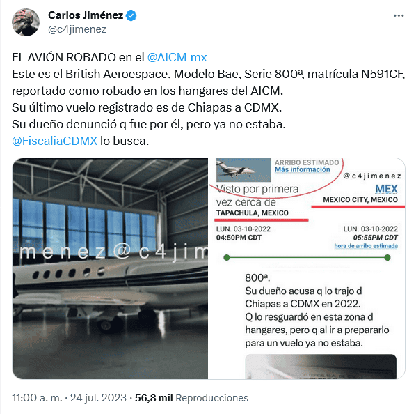 ¡Increíble! En redes sociales, el periodista Carlos Jiménez reportó el robo de un avión que presuntamente estaba guardado en el Aeropuerto Internacional de la Ciudad de México (AICM).En su cuenta de Twitter, el también llamado C4 Jiménez explica que está desaparecida una aeronave British Aeroespace, Modelo Bae, Serie 800ª, matrícula N591CF.En su cuenta personal de Twitter, C4 escribió: "Su último vuelo registrado es de Chiapas a CDMX. Su dueño denunció que fue por él, pero ya no estaba".También dijo que la Fiscalía General de Justicia de la Ciudad de México ya buscaba el avión, aunque las propias autoridades no han confirmado los hechos. OF