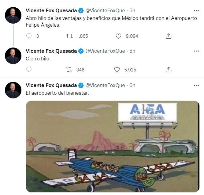 Luego de que el Aeropuerto Internacional Felipe Ángeles (AIFA) fuera inaugurado el día de ayer, las burlas y los memes no se han hecho esperar y ya circulan en las redes. Además, líderes de opinión, periodistas, influencers o simplemente usuarios de redes sociales, han criticado y exhibido las deficiencias de una de las obras insignia del sexenio de Andrés Manuel López Obrador. Sobre esa línea, fue uno de quienes no tardaron en reaccionar, ha sido el expresidente de la República Mexicana (2000-2006) Vicente Fox Quesada, quien a través de su cuenta de Twitter y con su peculiar estilo, se ha burlado del nuevo aeropuerto Felipe Ángeles. El exmandatario compartió una publicación en la que "abre un hilo" de los beneficios que tendrá nuestro país con el Aeropuerto Internacional Felipe Ángeles, sin embargo, la siguiente publicación de Fox Quesada es un "cierro hilo". Lo anterior refiriendo que no había beneficios de la nueva terminal aérea. Durante la inauguración del nuevo aeropuerto, Andrés Manuel López Obrador se mostró efusivo y reiteró en varias ocasiones "misión cumplida". No obstante, no todos comparten su entusiasmo y hay una larga lista de personas que han manifestado su malestar en torno a la obra. JL
