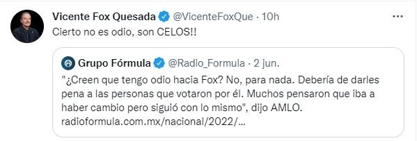 En días pasados, el presidente de la República, Andrés Manuel López Obrador señaló que a quien haya votado por Vicente Fox, debería darle pena, pues el exmandatario panista no cumplió con hacer un cambio en el país. López Obrador, descartó además tener algún tipo de odio por Vicente Fox Quesada y señaló que no lo considera su enemigo, simplemente es un adversario. "¿Creen que tengo odio hacia Fox? No, para nada. Debería de darles pena a las personas que votaron por él. Muchos pensaron que iba a haber cambio pero siguió con lo mismo". Tras estas declaraciones y fiel a su estilo, Vicente Fox no se guardó nada y le respondió a través de sus redes sociales. "Cierto no es odio, son CELOS!!", es el mensaje que compartió el exmandatario en su cuenta de Twitter, en respuesta a una nota en la que se recogían las declaraciones del actual Presidente de México. Esta no es la primera vez que Vicente Fox se enfrasca en un cruce de declaraciones con Andrés Manuel López Obrador, pues recurrentemente aprovecha sus redes sociales para contestar o criticar las acciones del Mandatario. JL