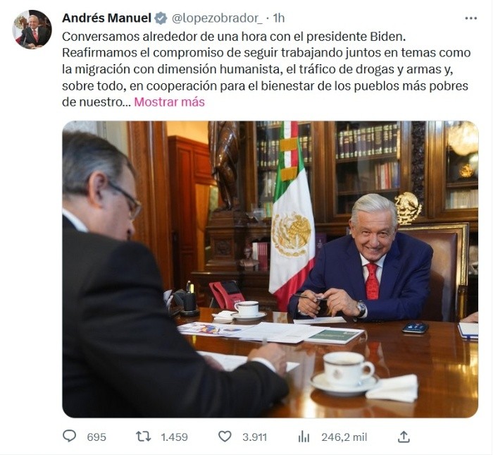La videollamada programada entre el Presidente Andrés Manuel López Obrador y su homólogo de Estados Unidos, Joe Biden, concluyó esta mañana.A las 10:37 horas, el canciller Marcelo Ebrard salió de Palacio Nacional por el estacionamiento localizado en la calle Correo Mayor sin dar declaraciones a la prensa.La llamada entre ambos presidentes fue programada a las 09:30 horas de este martes.Ayer lunes, el Presidente López Obrador adelantó que en la videollamada se abordaría el tema migratorio, combate al tráfico de fentanilo y la cooperación económica para el desarrollo regional."Mañana voy a tener una llamada, una videoconferencia con el presidente Biden, mañana. Los temas… les informo para que ustedes tengan como se dice coloquialmente, nota, que no se vaya a pensar que sólo se expone y no hay nota ¿dónde está la nota? Los temas migración, fentanilo y cooperación económica para el desarrollo. Son los tres temas", informó López Obrador ayer lunes.El Presidente Andrés Manuel López Obrador informó que conversó por teléfono por cerca de una hora con el mandatario de Estados Unidos, Joe Biden, y reafirmaron el compromiso de seguir trabajando de manera conjunta en el combate al tráfico de drogas, armas y en el tema migratorio "con dimensión humanista".El Presidente López Obrador manifestó en redes sociales que México y Estados Unidos son "buenos vecinos y amigos".Durante la llamada, el Mandatario de México estuvo acompañado del secretario de Relaciones Exteriores, Marcelo Ebrard."Conversamos alrededor de una hora con el presidente Biden. Reafirmamos el compromiso de seguir trabajando juntos en temas como la migración con dimensión humanista, el tráfico de drogas y armas y, sobre todo, en cooperación para el bienestar de los pueblos más pobres de nuestro continente, Somos buenos vecinos y amigos", escribió López Obrador.JM