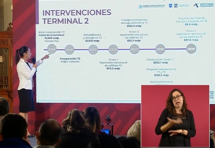 La jefa de Gobierno de la Ciudad de México, Claudia Sheinbaum Pardo, informó en la “mañanera” del Presidente López Orador desde Palacio Nacional que los trabajos de rehabilitación de la Terminal 2 del Aeropuerto Internacional de la Ciudad de México (AICM) tendrán un costo aproximado de 400 millones de pesos y un tiempo de trabajo de por lo menos 10 meses, pero aseguró que no interrumpirá las operaciones porque todo será por la parte baja de la terminal aeroportuaria.La jefa de gobierno de la Ciudad de México también señaló que los desniveles y oquedades de la Terminal 2 no presentan grandes riesgos, pero es necesario que se rehabilite porque si no “si tendría riesgos frente a un sismo”.Asimismo, Sheinbaum recordó que la Terminal 2 se construyó con el sexenio de Vicente Fox, con un costo estimado de 10 mil millones de pesos y que fue planeado para tener una vida de 15 años, pues se tenía planeado construir un nuevo aeropuerto en el exlago del Texcoco. “¿Cómo se va a resolver este problema? En este momento, de acuerdo con el Instituto de Seguridad de las Construcciones de la Ciudad de México no tiene grandes riesgos, pero tienen necesariamente que intervenirse porque si no sí tendría riesgos frente a un sismo.“Esto va a costar 400 millones de pesos. Tiene un tiempo de ejecución de 10 meses y pues el problema es cómo se diseñó el edificio y que iba a hacer un edificio que, aparte de que costó 10 mil millones de pesos, se había planeado que iba a ser demolido. (...) Importante que se sepa es que no se va a interrumpir las operaciones del Aeropuerto, de la Terminal 2 porque todo va a ser por la parte baja”, explicó.Recuerda que ya puedes seguir minuto a minuto la "mañanera" a través de las cuentas oficiales del Gobierno de México:MS