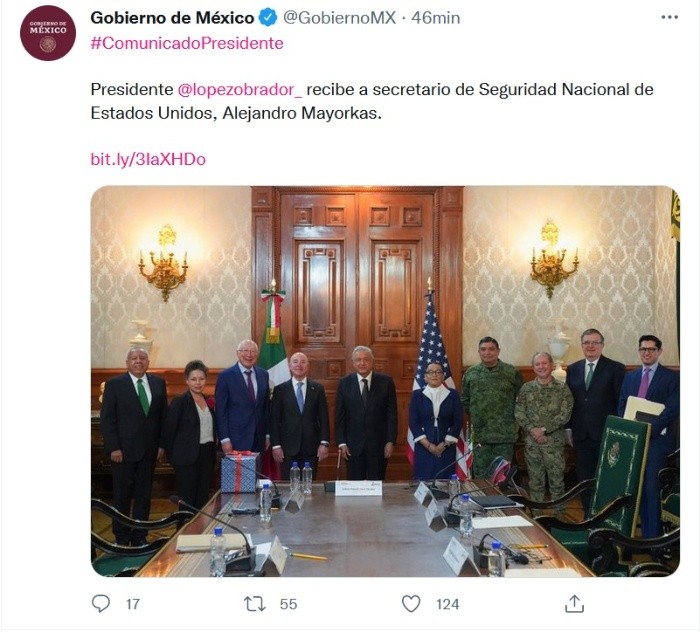 El Presidente de México, Andrés Manuel López Obrador (AMLO), conversó este lunes de "trabajo y migración" con Alejandro Mayorkas, titular del Departamento de Seguridad Nacional (DHS) de Estados Unidos, quien realiza su cuarta visita al país."Sostuvimos una reunión con Alejandro Mayorkas, secretario de Seguridad Nacional de EU. Tratamos asuntos de trabajo y migración. Seguimos promoviendo la cooperación para el desarrollo con justicia y respeto a los derechos humanos", compartió AMLO en sus redes sociales.La visita de Mayorkas, anunciada apenas el viernes pasado, transcurrió con hermetismo y sin una agenda pública en el Palacio Nacional, donde también estuvieron el embajador de Estados Unidos, Ken Salazar, y los secretarios mexicanos de Seguridad, de Defensa Nacional, de Marina y de Relaciones Exteriores.Los funcionarios de ambos países "intercambiaron puntos de vista sobre el panorama migratorio de la región en el futuro cercano y la necesidad de aumentar esfuerzos para tener flujos seguros, ordenados y regulares", según Roberto Velasco, jefe de la Unidad para América del Norte de la Cancillería."Además, ambas delegaciones coincidimos en la importancia de agilizar esfuerzos de cooperación para el desarrollo", indicó Velasco en sus redes sociales.La gira de Mayorkas, que este martes visitará Costa Rica, es para discutir con funcionarios locales "un enfoque regional para detener la migración irregular y crear vías legales viables", según expuso Washington el viernes.AMLO había adelantado en su conferencia mañanera que se hablaría de "migración, frontera sur, frontera norte, los programas de cooperación para el desarrollo, aduanas y todo lo que tiene que ver con la relación México-Estados Unidos".Este viaje oficial ocurre después de que AMLO anunciara el viernes que realizará una gira en mayo por El Salvador, Honduras, Guatemala, Belice y Cuba para abordar la ola migratoria que afronta la región y sus propuestas para "atender las causas".ER